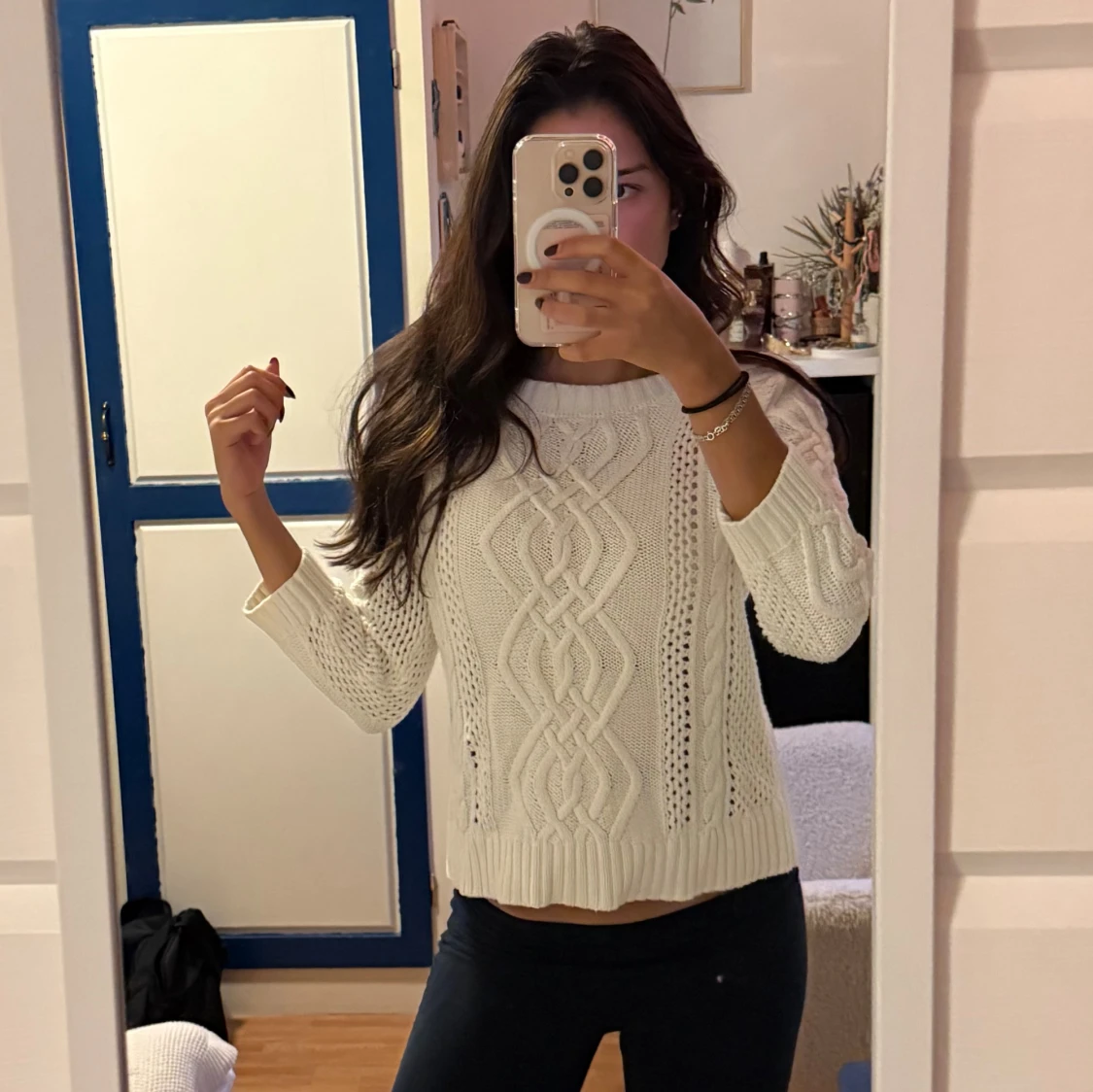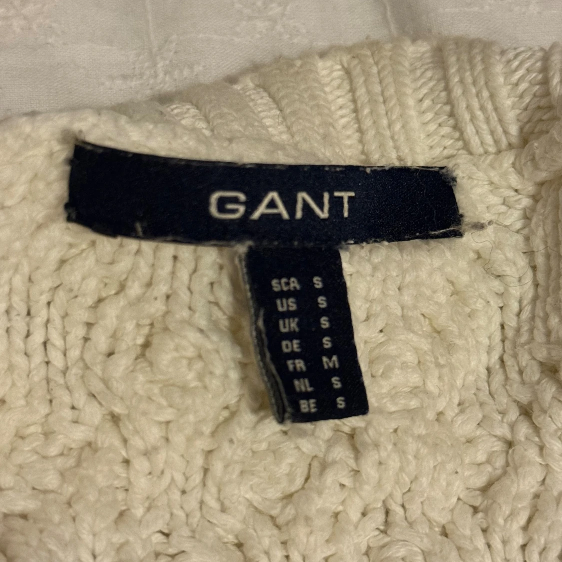 Säljer en vit stickad tröja från GANT med snyggt flätmönster framtill och ribbade muddar. Passar mig bra som brukar ha xs-s. I fint skick! Skriv för fler frågor ❤️