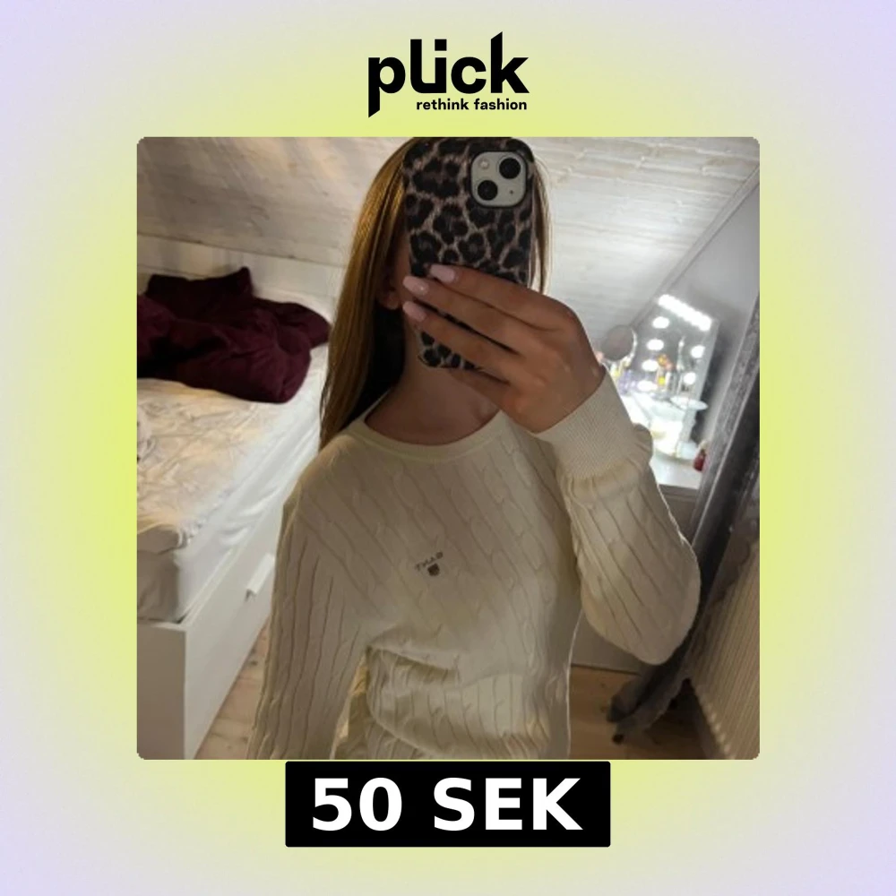 Säljer en stilren vit stickad tröja från Gant med kabelstickat mönster. Tröjan har långa ärmar och en rund halsringning. Perfekt för en avslappnad och snygg look.