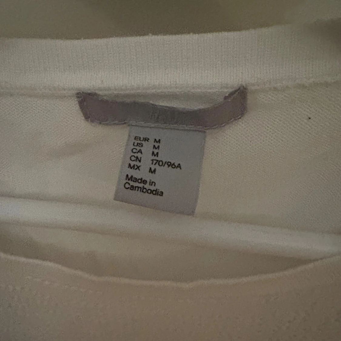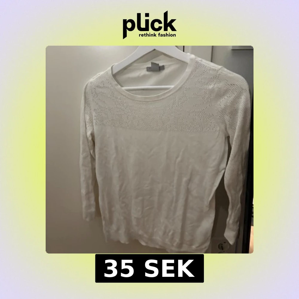 Säljer en vit tröja från H&M i storlek M. Tröjan har ett diskret hålmönster upptill och långa ärmar.