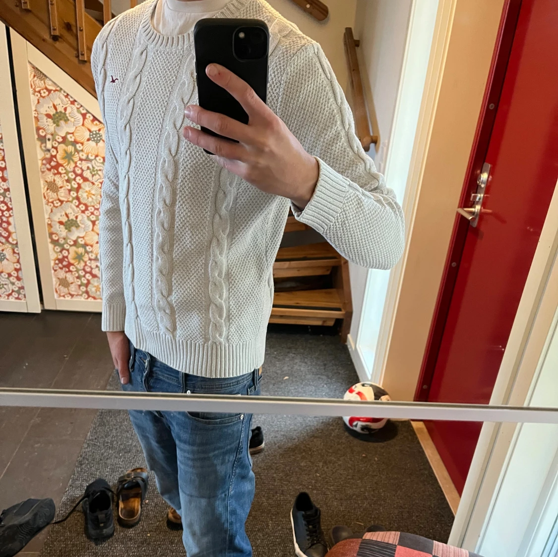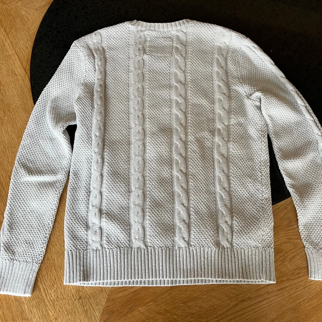 Vit stickad tröja från Hollister med grova kabelstickade detaljer framtill och ribbade muddar vid ärmslut och nederkant. Rund hals och långärmad modell, med diskret Hollister-logga broderad på bröstet. Perfekt för dig som gillar klassisk och clean stil.
