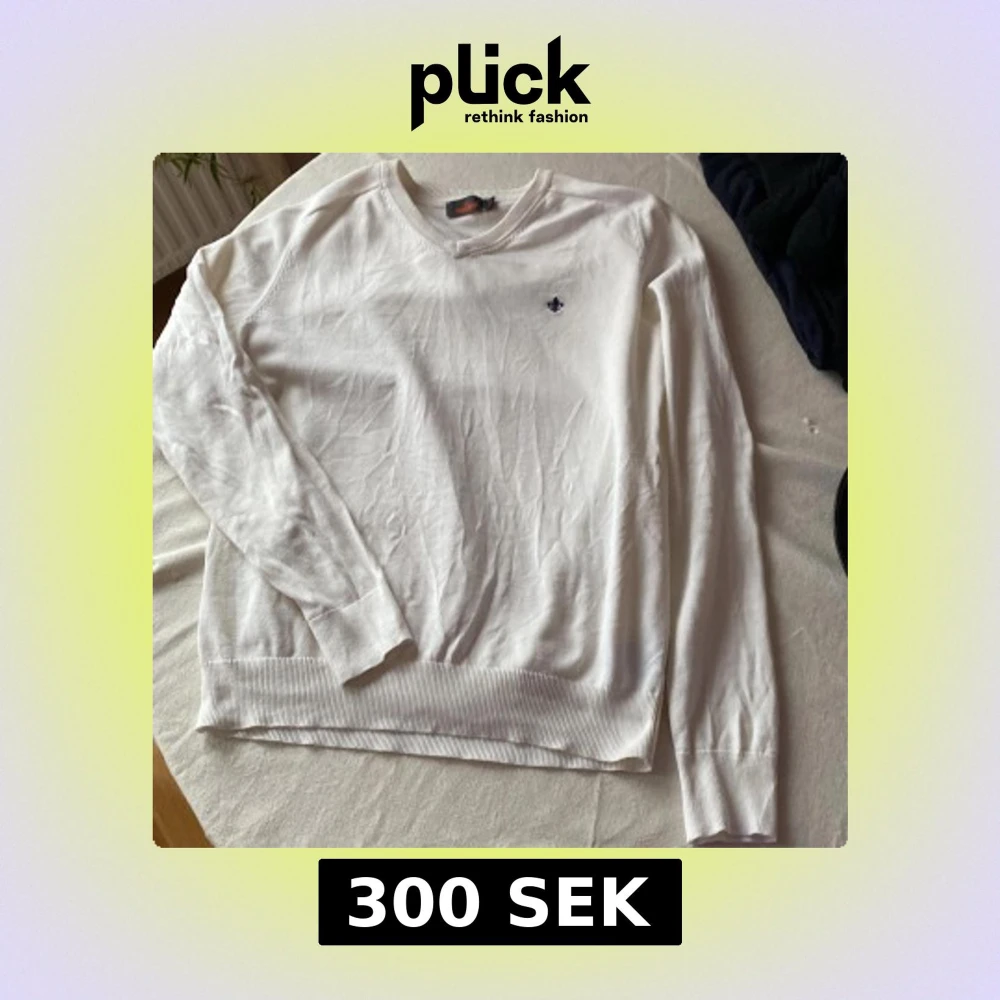 Vit stickad tröja från Morris i storlek S. Tröjan har v-ringad hals och ett mörkblått broderat emblem på bröstet. Ribbstickade muddar vid ärmslut och nederkant ger en clean och klassisk look. Perfekt för dig som gillar stilrena plagg.
