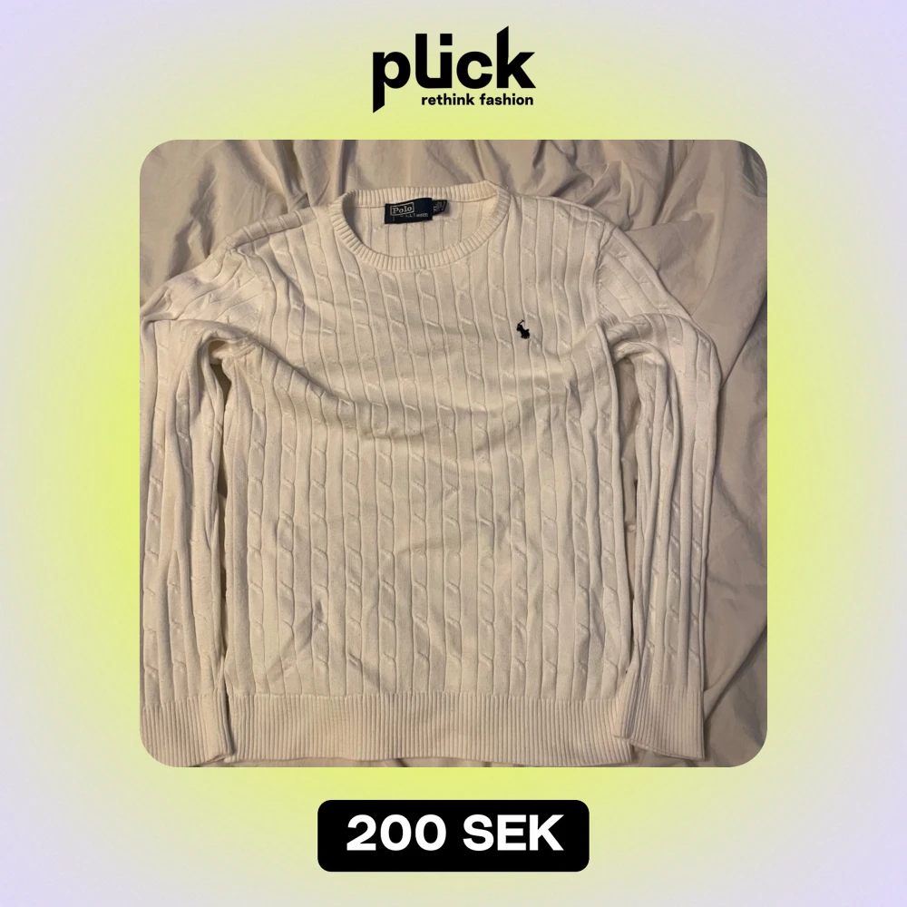 Säljer en snygg vit stickad tröja från Polo Ralph Lauren. Den har ett klassiskt kabelstickat mönster och en liten broderad logga på bröstet. Perfekt för både höst och vinter,