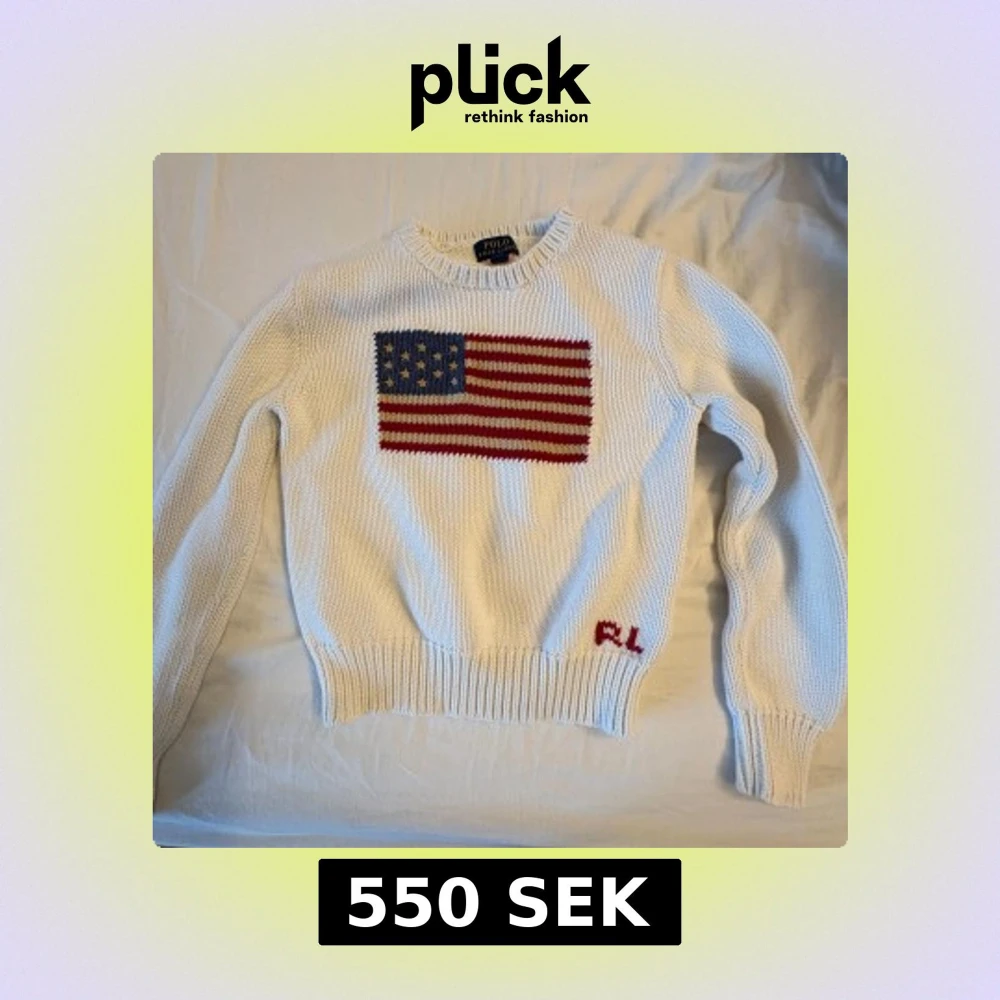 Säljer en vit stickad tröja från Ralph Lauren med en stor amerikansk flagga på framsidan. Tröjan har långa ärmar och en rund halsringning. Perfekt för en stilren och klassisk look.