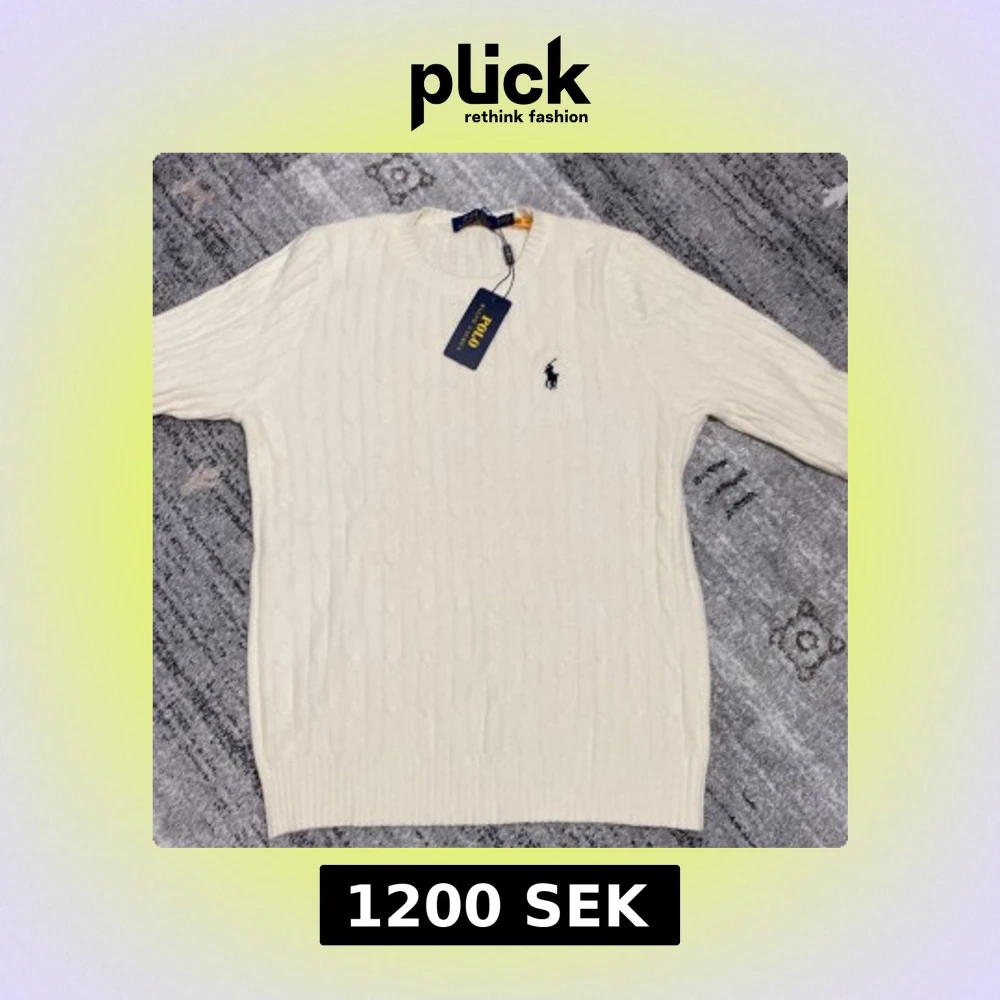 Säljer en stilren vit stickad tröja från Ralph Lauren med det klassiska logotypbroderiet på bröstet. Tröjan har en rund halsringning och långa ärmar, perfekt för kyligare dagar. Ett måste i garderoben för den som älskar tidlös design.