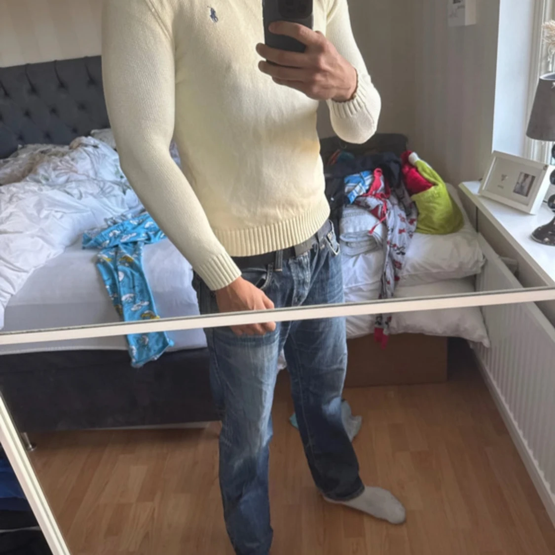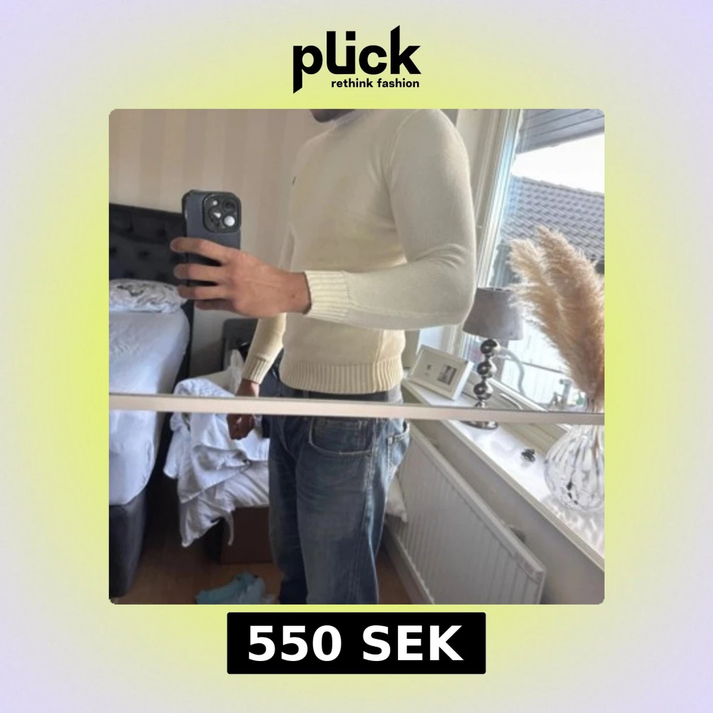Säljer en stilren vit stickad tröja från Ralph Lauren med den klassiska loggan broderad på bröstet. Tröjan har rund hals, ribbade muddar och är långärmad. Perfekt för dig som gillar clean och enkel stil. Denna e cremfärgad mer. Aldrig använd, pga att den e liten på mig