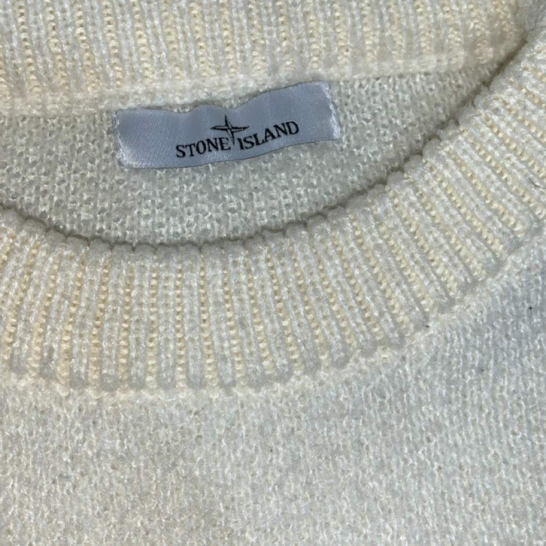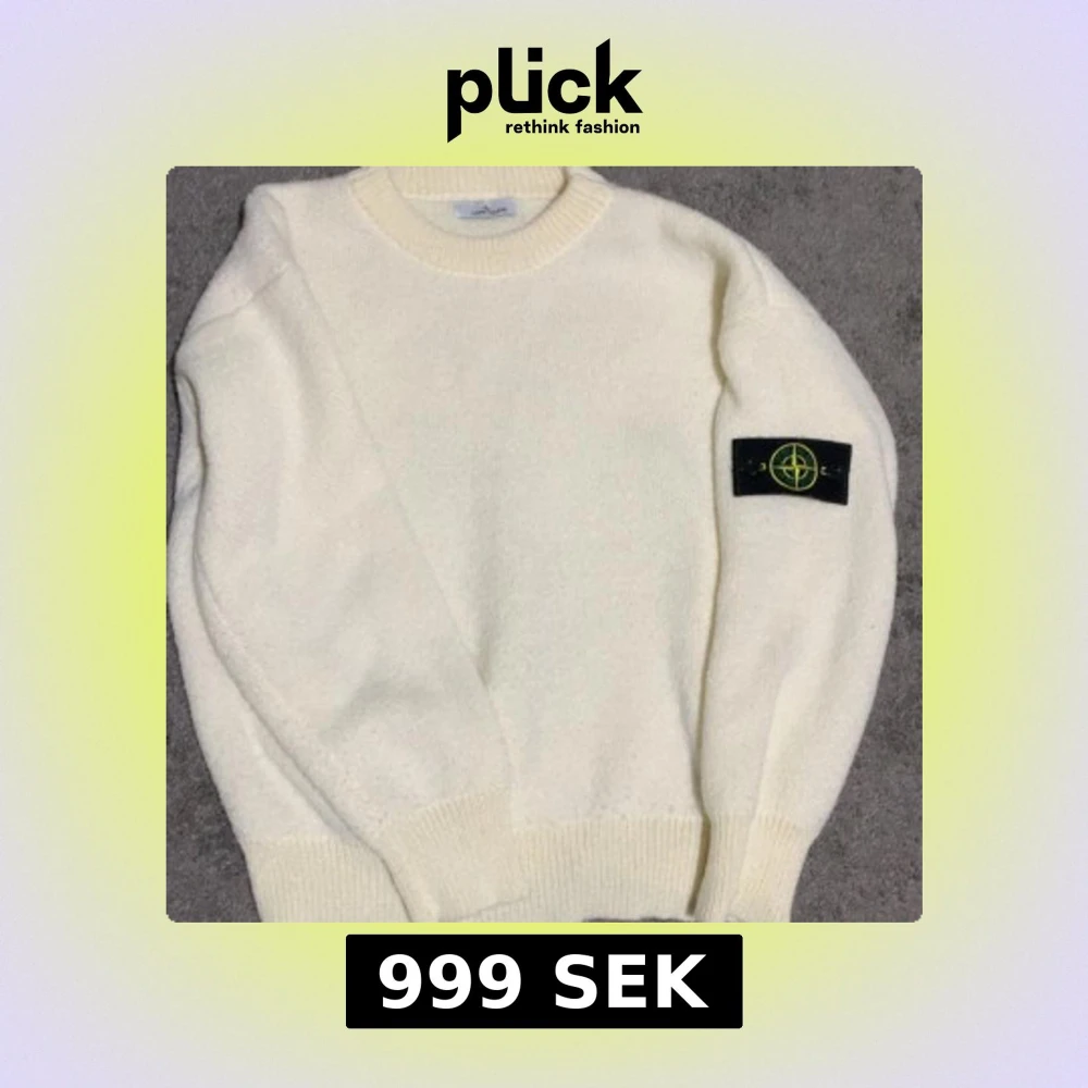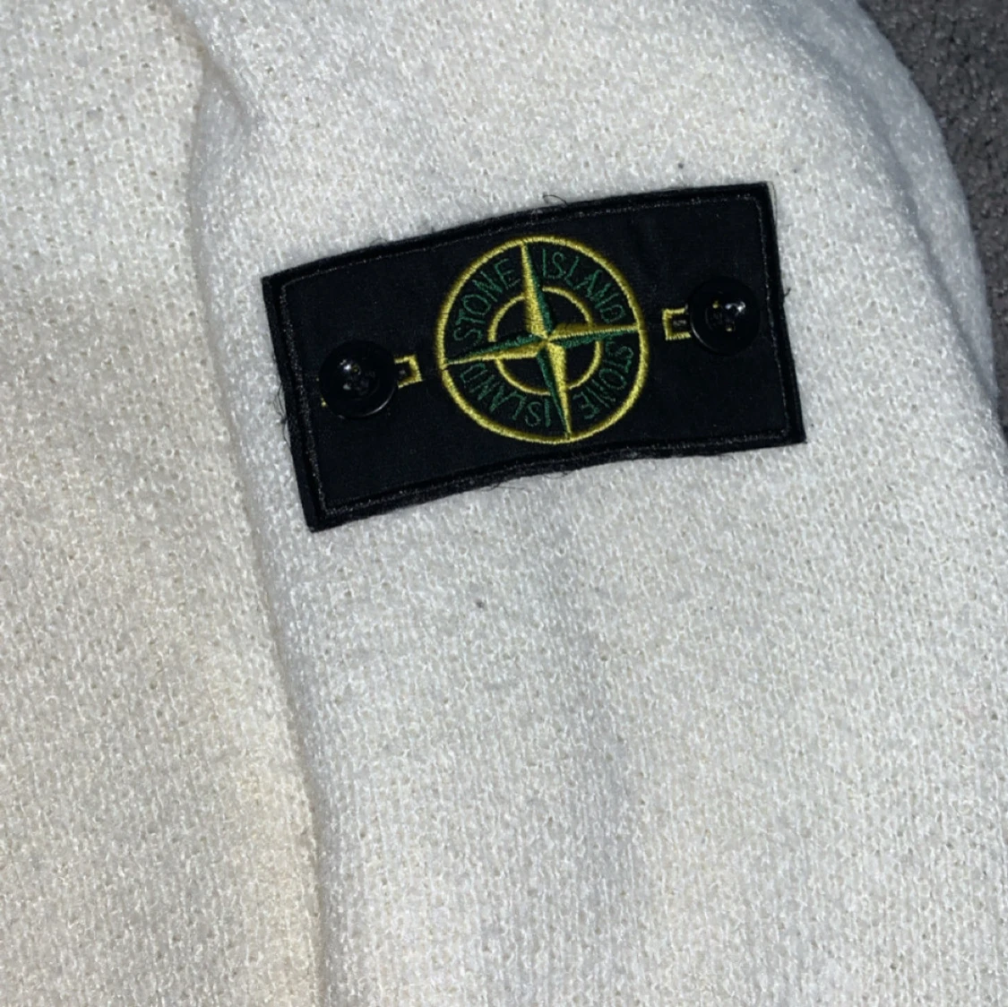 Säljer en clean vit stickad tröja från Stone Island med klassisk patch på ärmen. Tröjan har rund halsringning, ribbade muddar och är långärmad. Perfekt för dig som gillar stilrena och exklusiva plagg. Priset kan diskuteras🔥👌