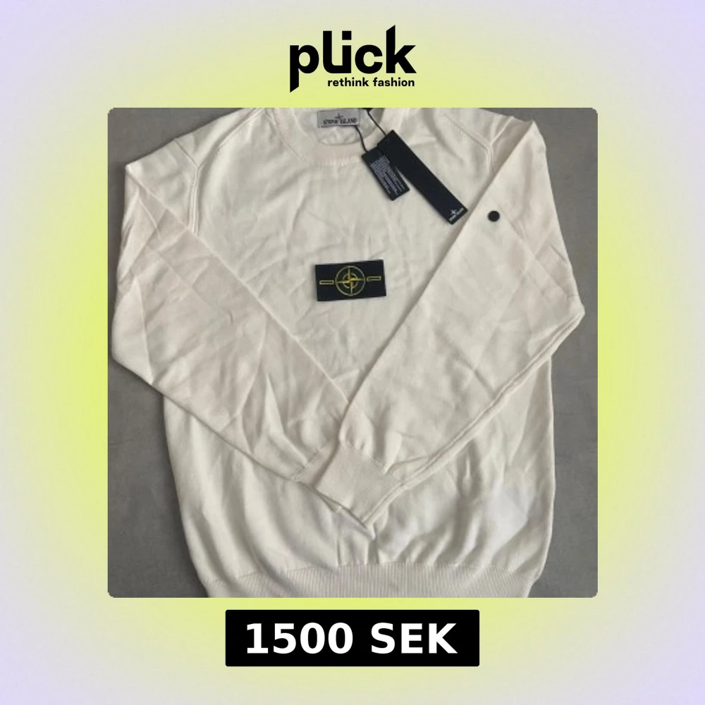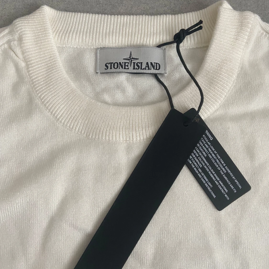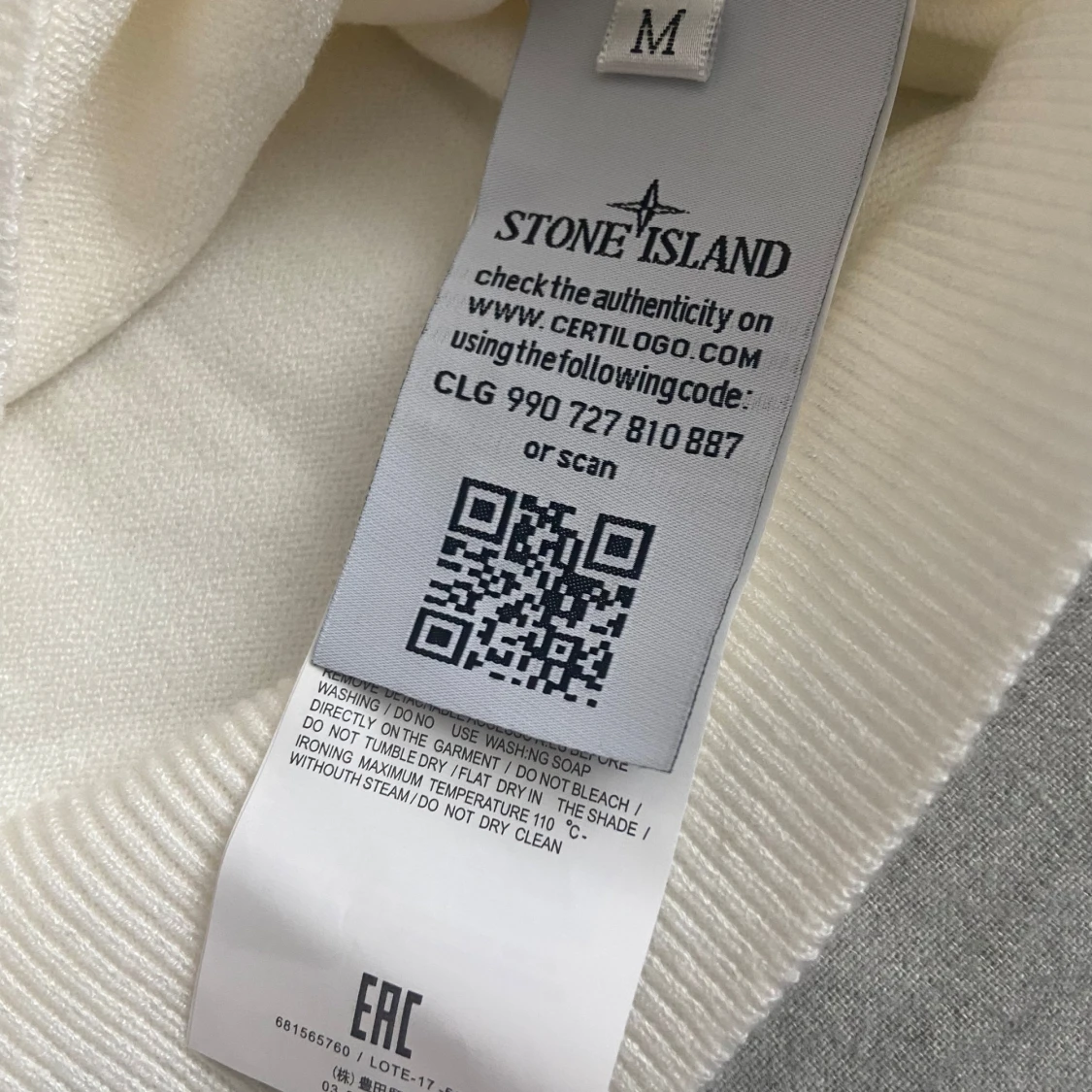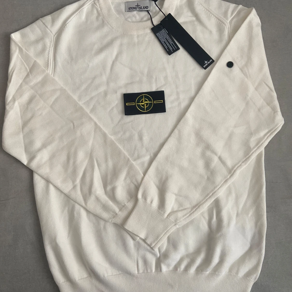 Vit stickad tröja från Stone Island med klassisk rund halsringning och ikonisk logotyp-patch på ärmen. Tröjan har ribbade muddar och är långärmad, perfekt för lager-på-lager. Snygg och stilren design som passar till det mesta.