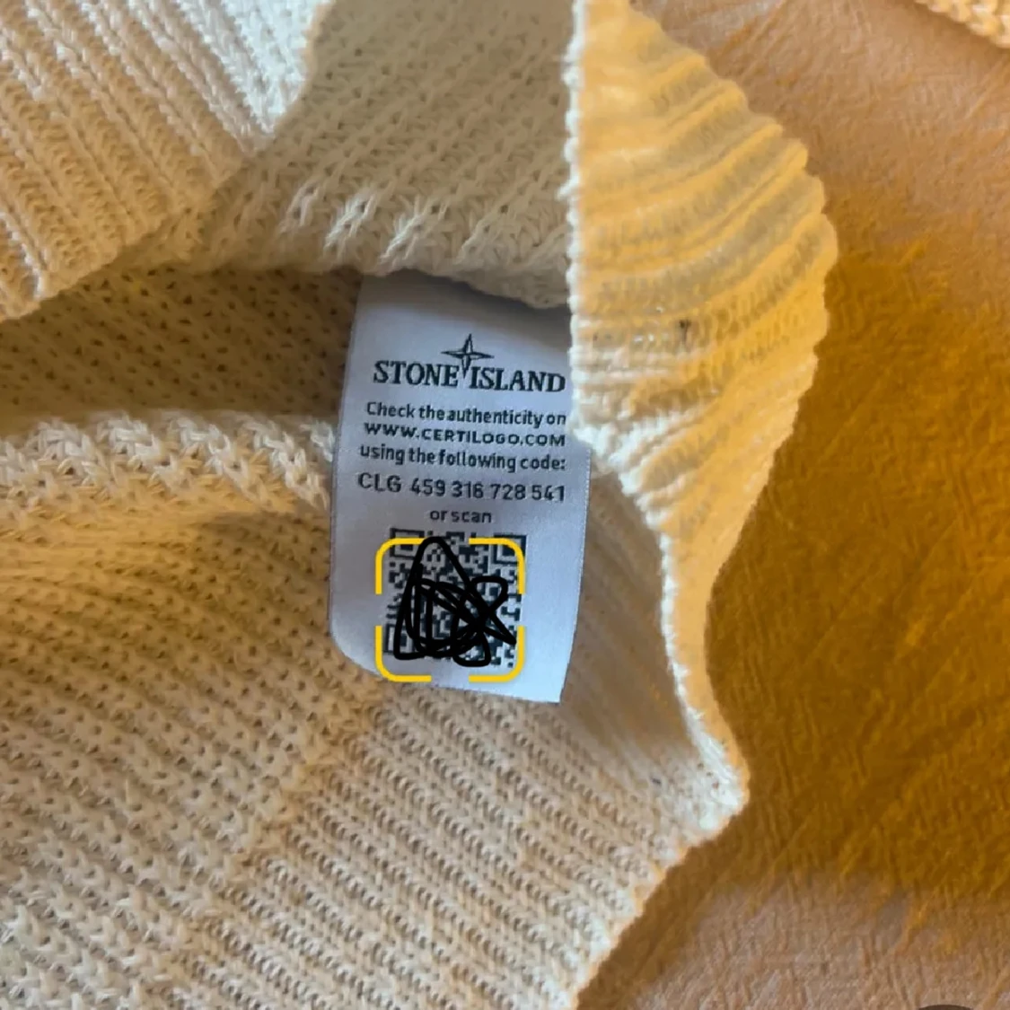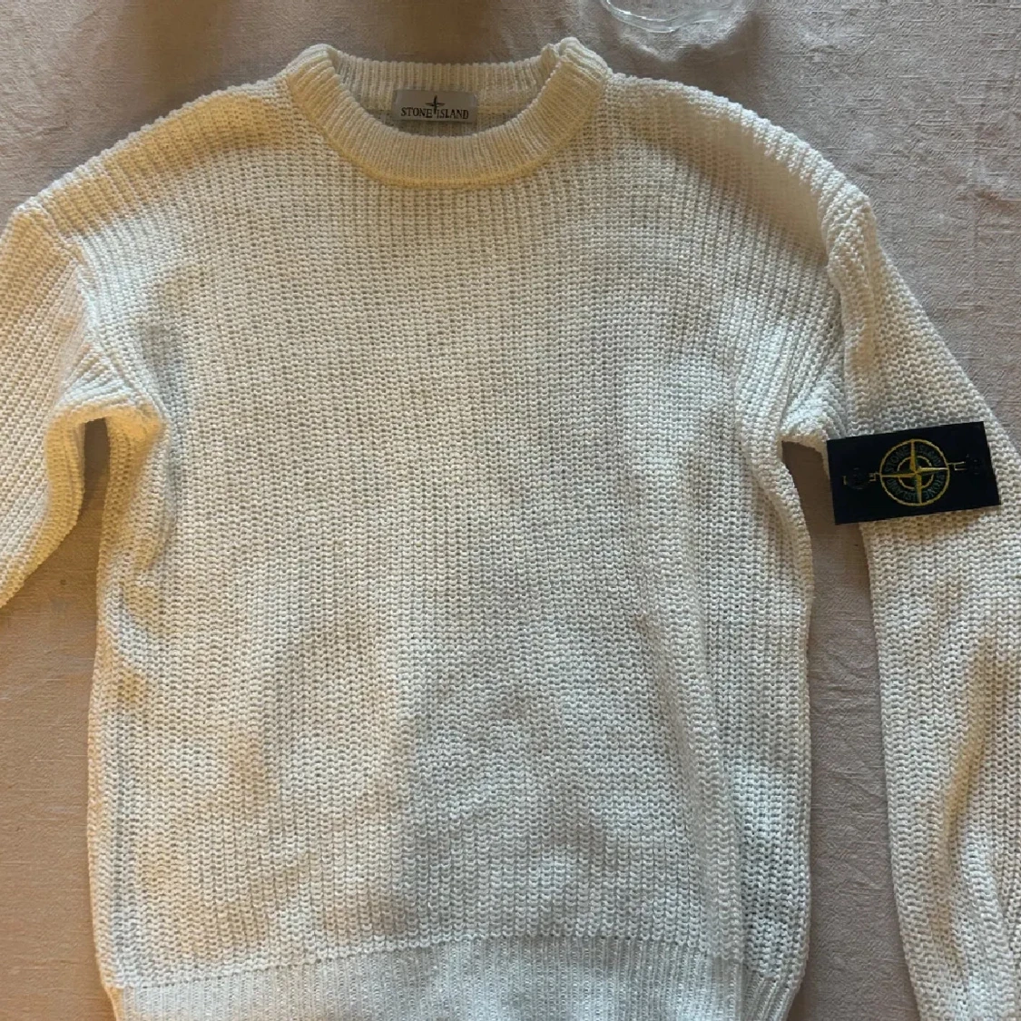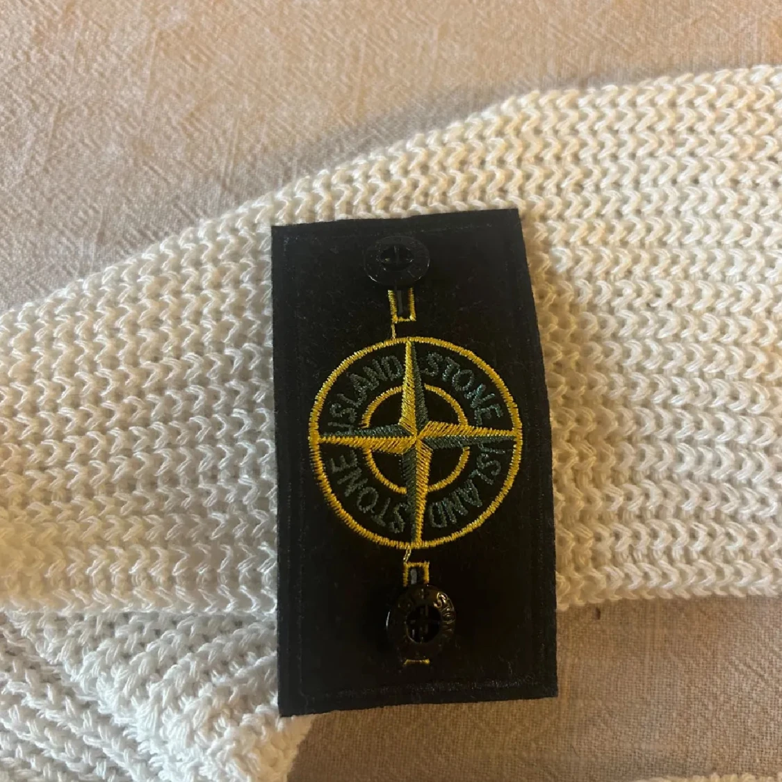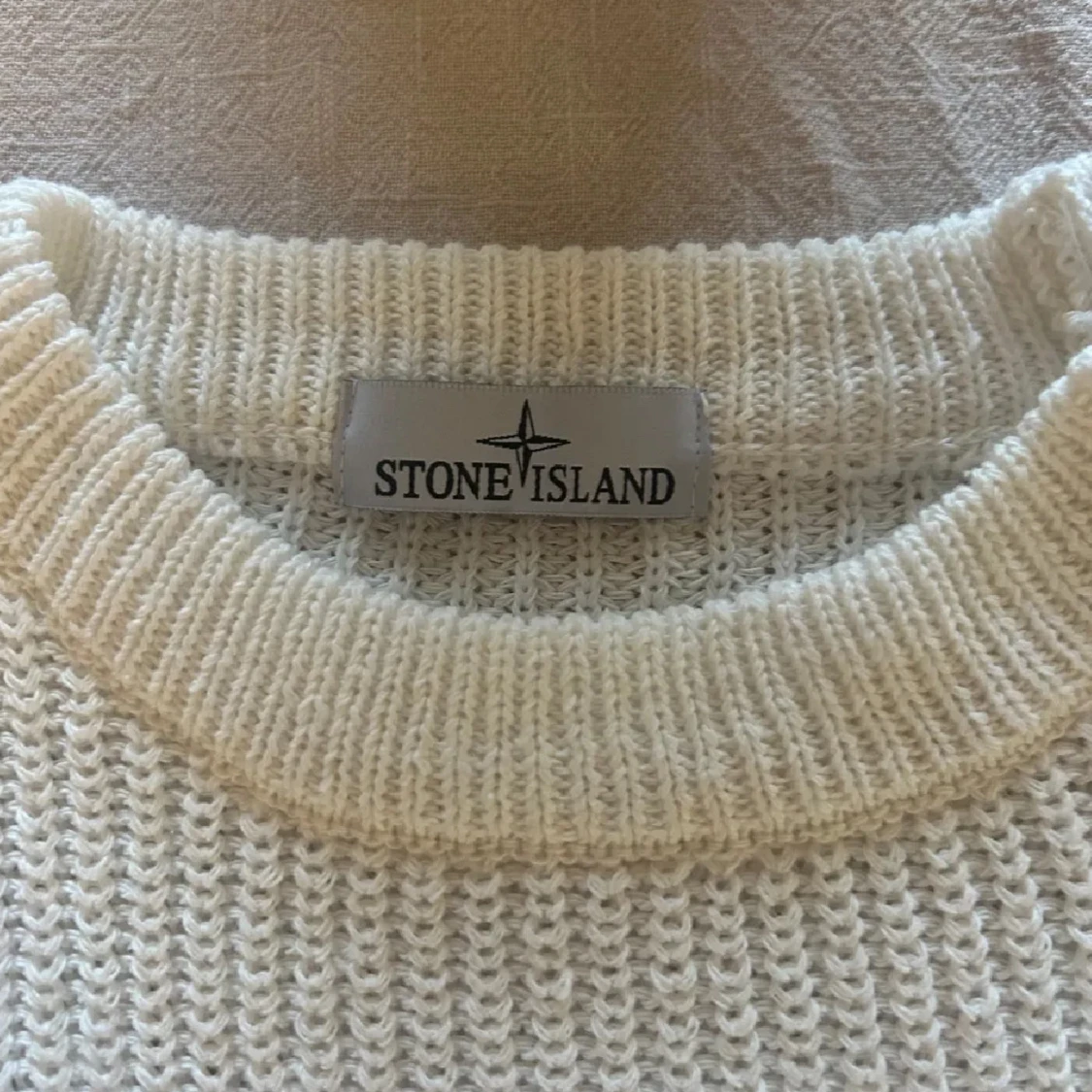 Säljer en stilren vit stickad tröja från Stone Island. Tröjan har en klassisk rund halsringning och det ikoniska Stone Island-märket på ärmen. Perfekt för att hålla sig varm och snygg under kyligare dagar.