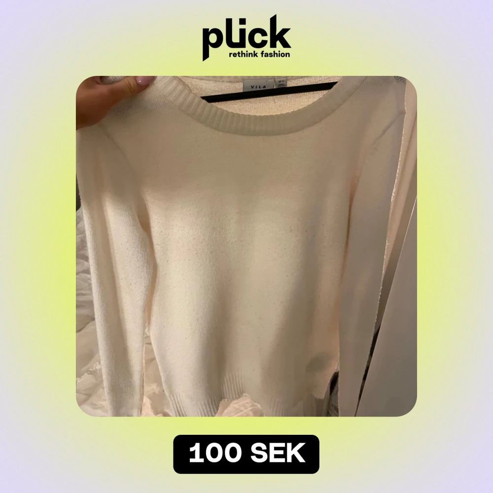 Säljer en vit stickad tröja från VILA i storlek S. Har tecken på användning så som att den är urtvättad💗