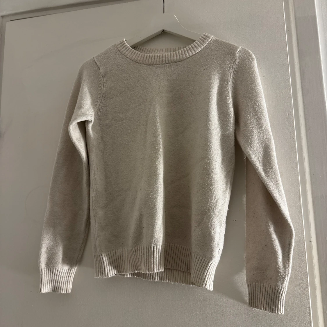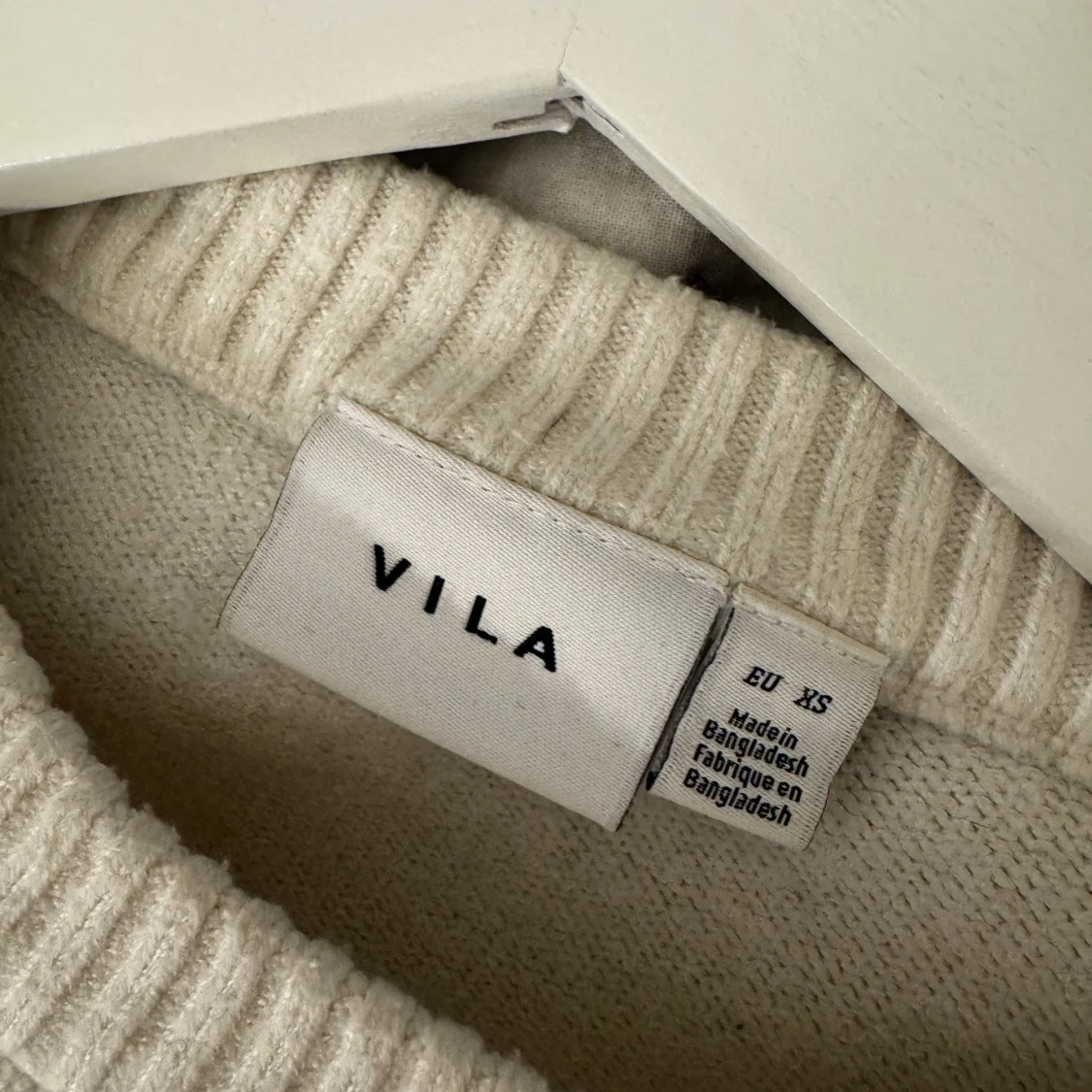 Säljer en stilren vit stickad tröja från VILA i storlek XS. Tröjan har långa ärmar och ribbade muddar vid ärmslut och nederkant. Perfekt för kyligare dagar!