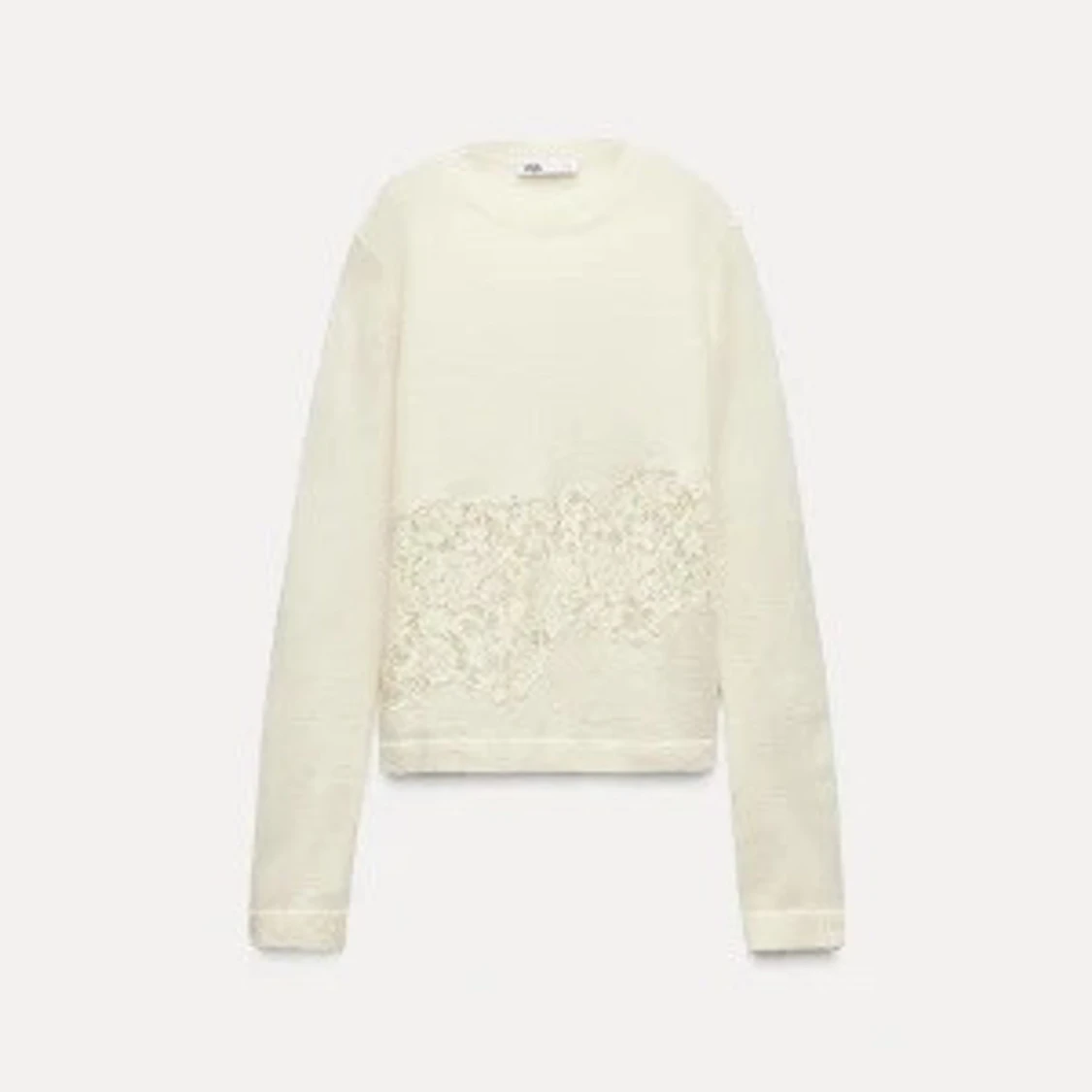 Superfin vit stickad tröja med lång ärm och bred spetsdetalj över magen från Zara som inte säljs längre. Säljer pågrund av att jag inte använder den längre. Kan sälja för billigare🩷🩵💕✨⭐️