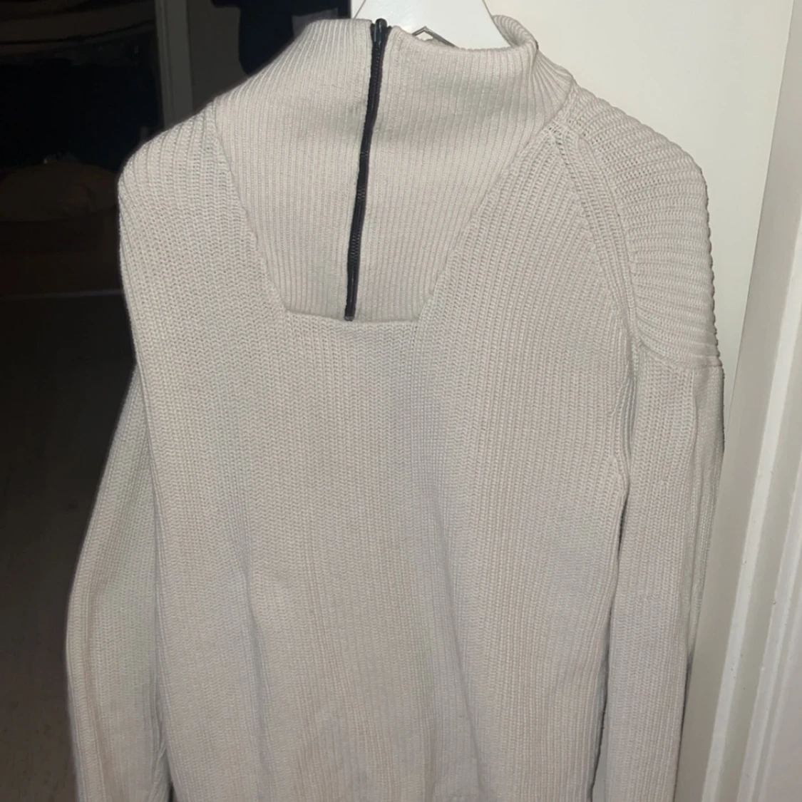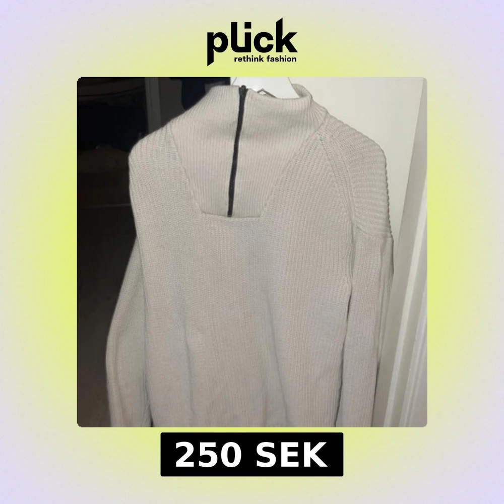 Säljer en stilren beige stickad tröja med en unik dragkedja i ryggen. Tröjan har en hög krage och långa ärmar, perfekt för kyligare dagar. Passar både till jeans och kjol! Köpt från tom tailor och använt fåtal gånger