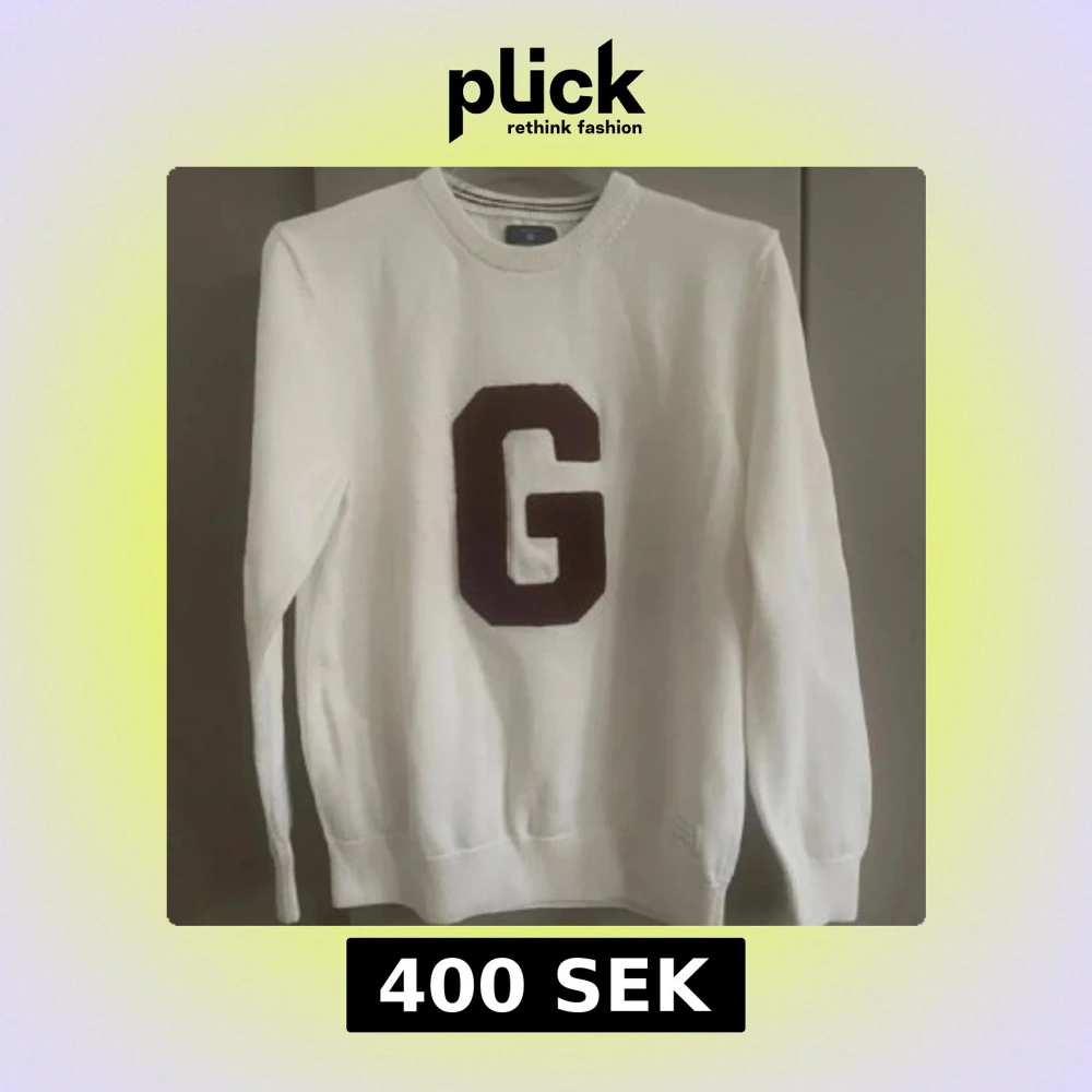 Vit stickad tröja från GANT med stor mörkröd G på bröstet. Rund hals med ribbad kant och diskret randig detalj. Långärmad och mjuk bomullskvalitet, perfekt för chill höst- och vinterdagar. Klassisk och clean look med college-vibe. Det är junior storlek men passar S