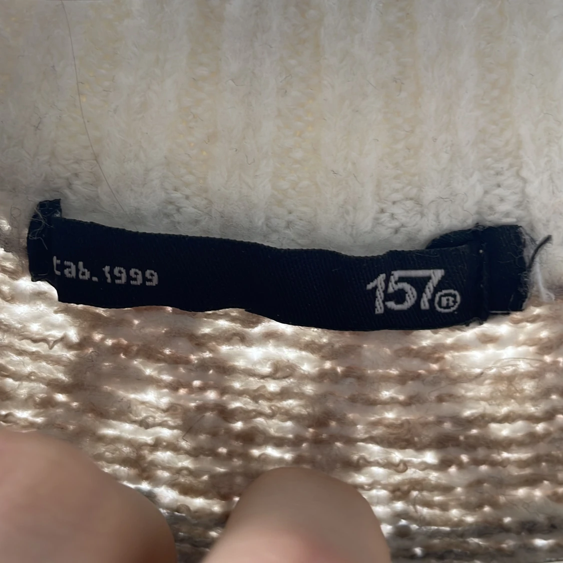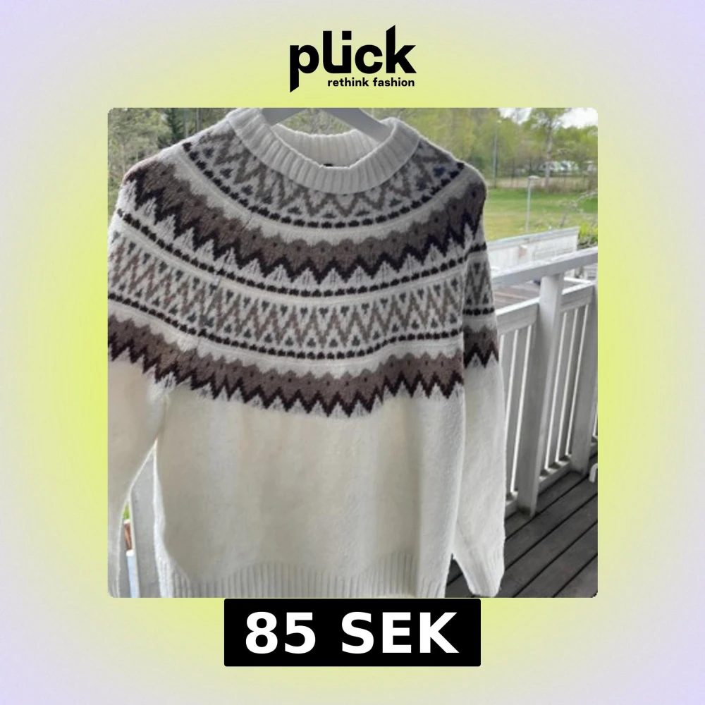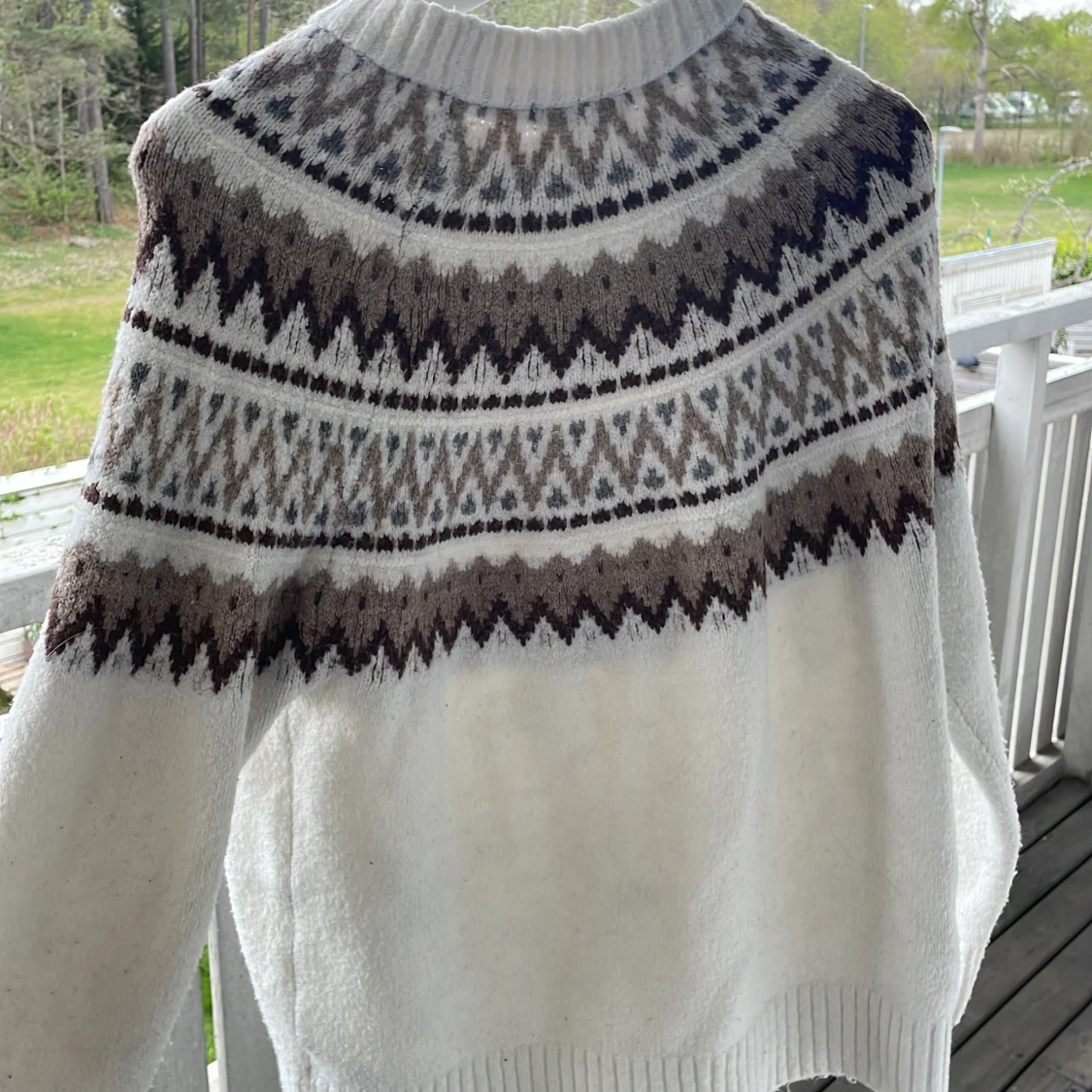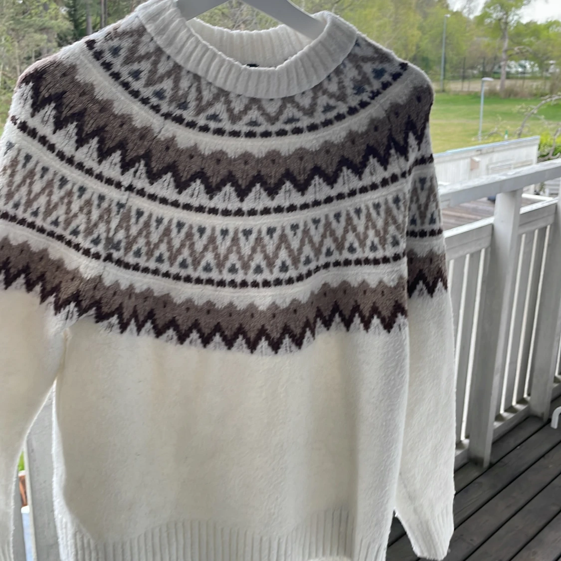 Säljer en vit stickad tröja från 157 med klassiskt nordiskt mönster i brunt och grått runt oket. Tröjan har rund halsringning och långa ärmar, perfekt för kyliga dagar.