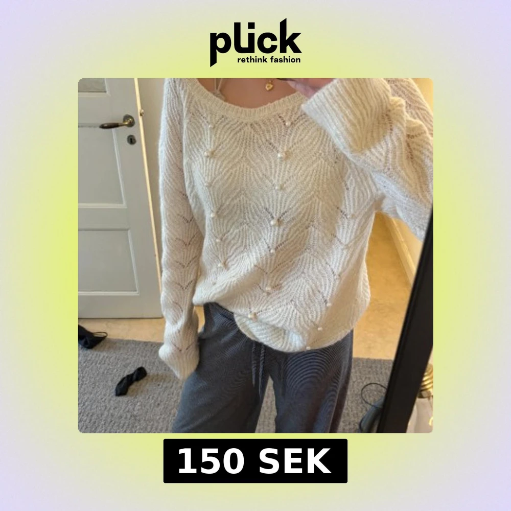 Säljer en vit stickad tröja från LOFT med dekorativa pärlor framtill. Tröjan har ett diskret mönster, rund halsringning och långa ärmar. Perfekt för lager-på-lager och ger en elegant touch till din outfit.