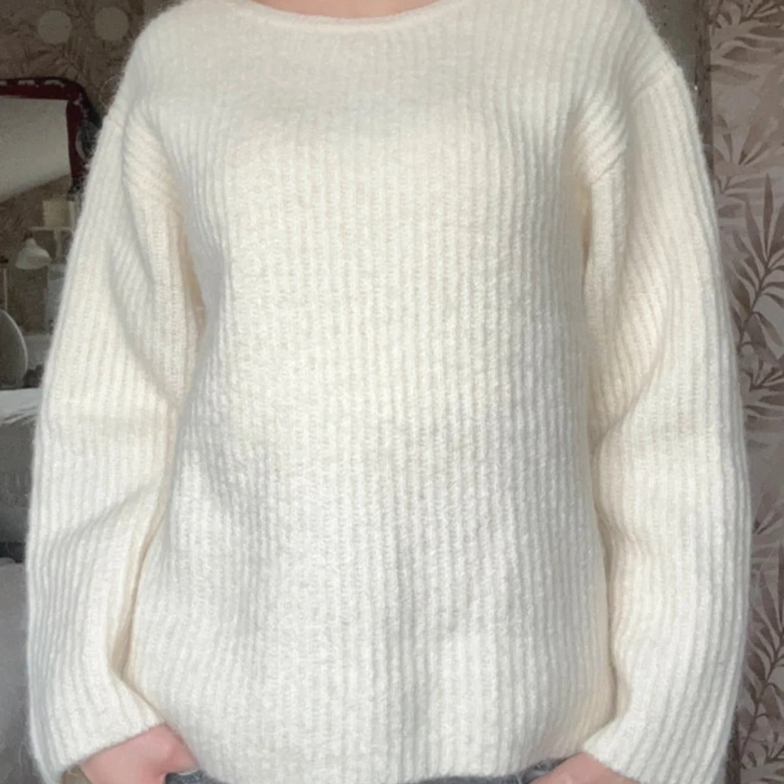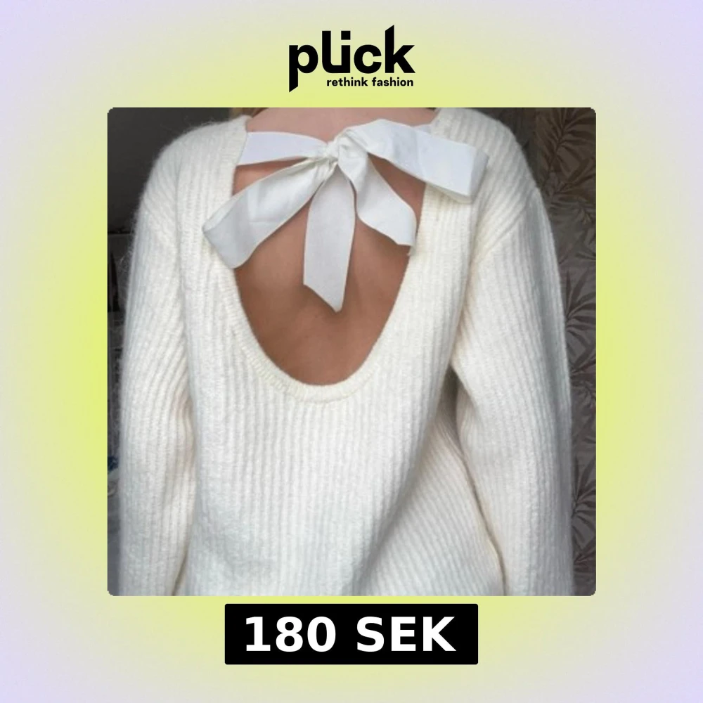 Superfin vit stickad tröja med öppen rygg och stor rosett i nacken. Tröjan har långärmade ärmar och en ribbad struktur som ger en mysig och trendig look. Perfekt för dig som vill ha något extra i vardagen. Endast använd nån enstaka gång 🩷
