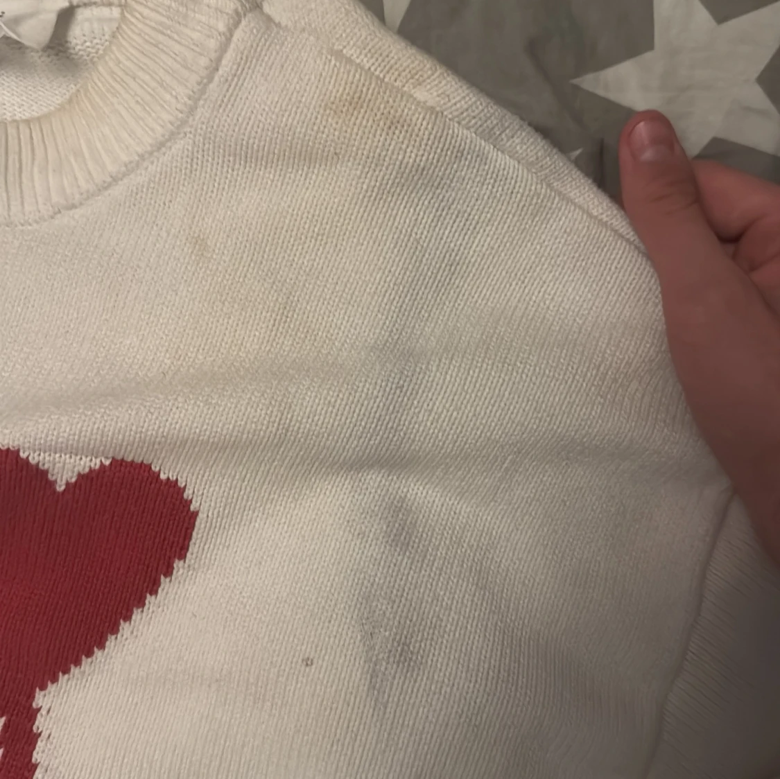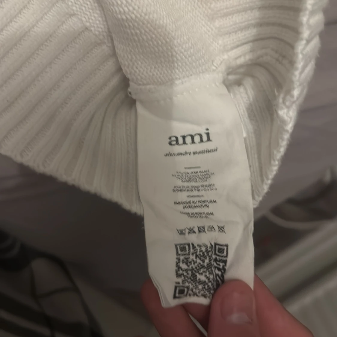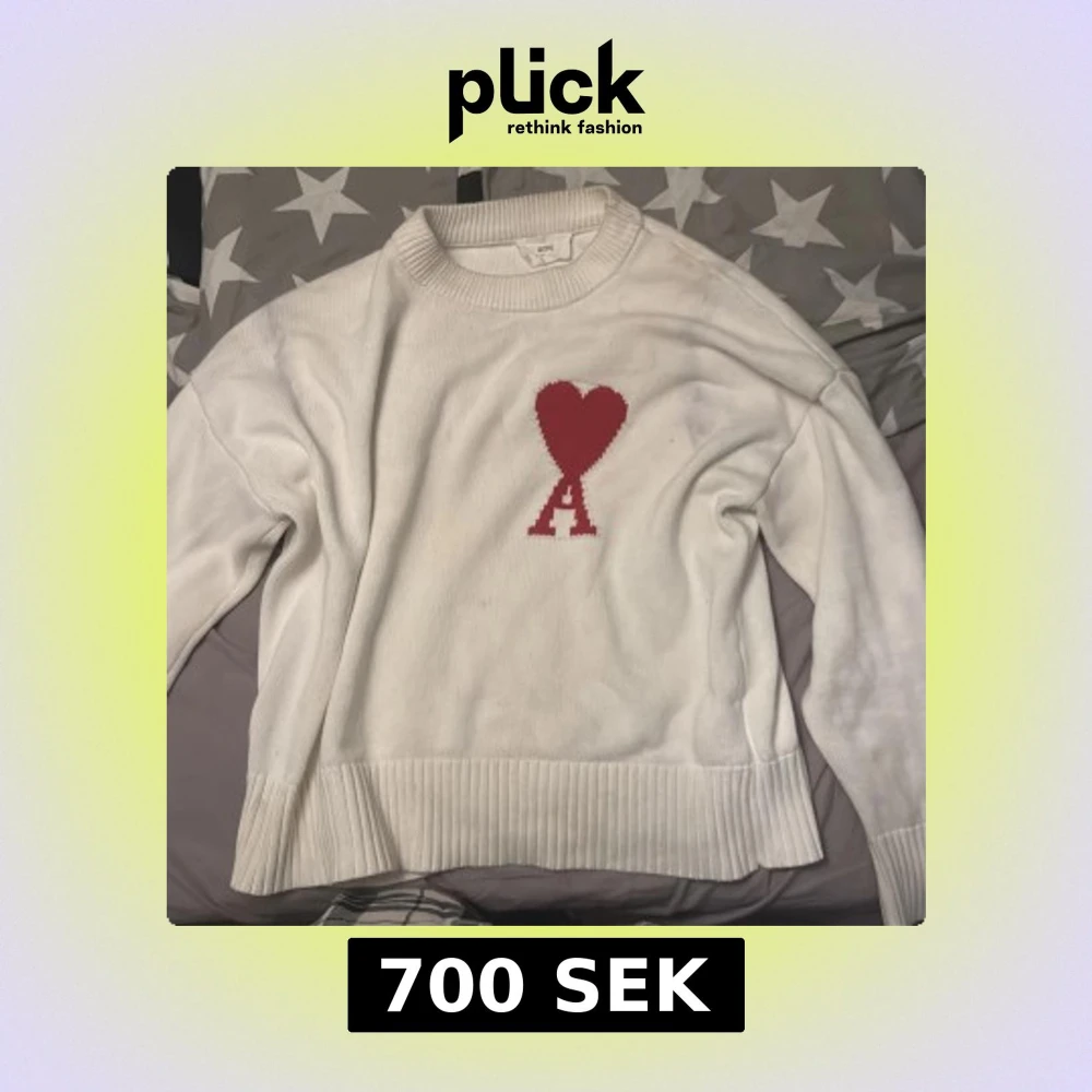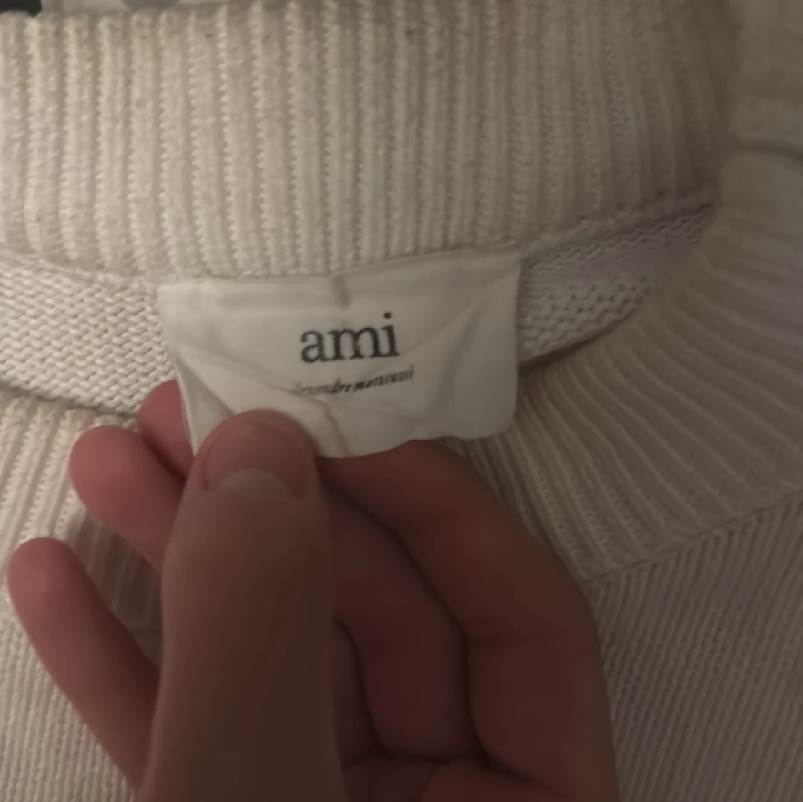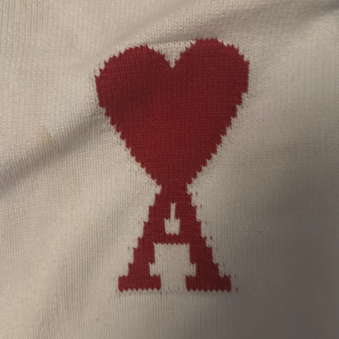 Vit stickad tröja från Ami med ett stort rött hjärta och bokstaven A på bröstet. Tröjan har ribbade muddar och rund hals. Perfekt för dig som gillar stilrena plagg med en twist priset kan diskuteras 🤩