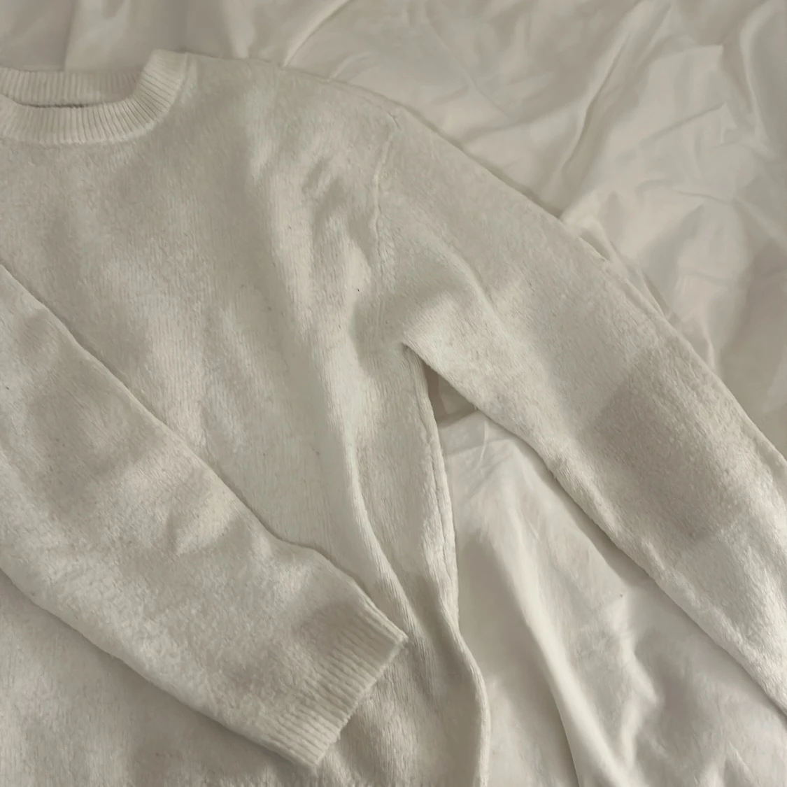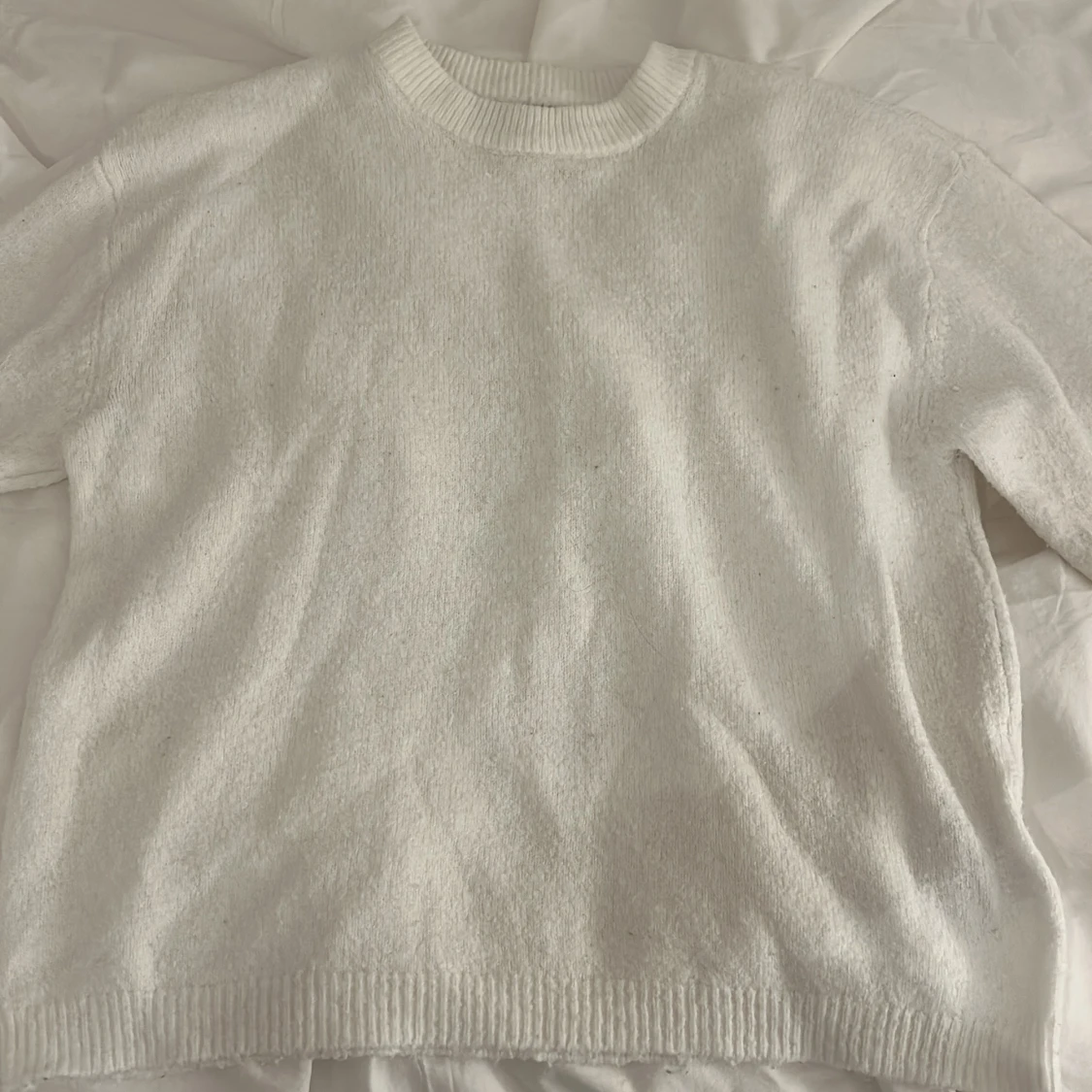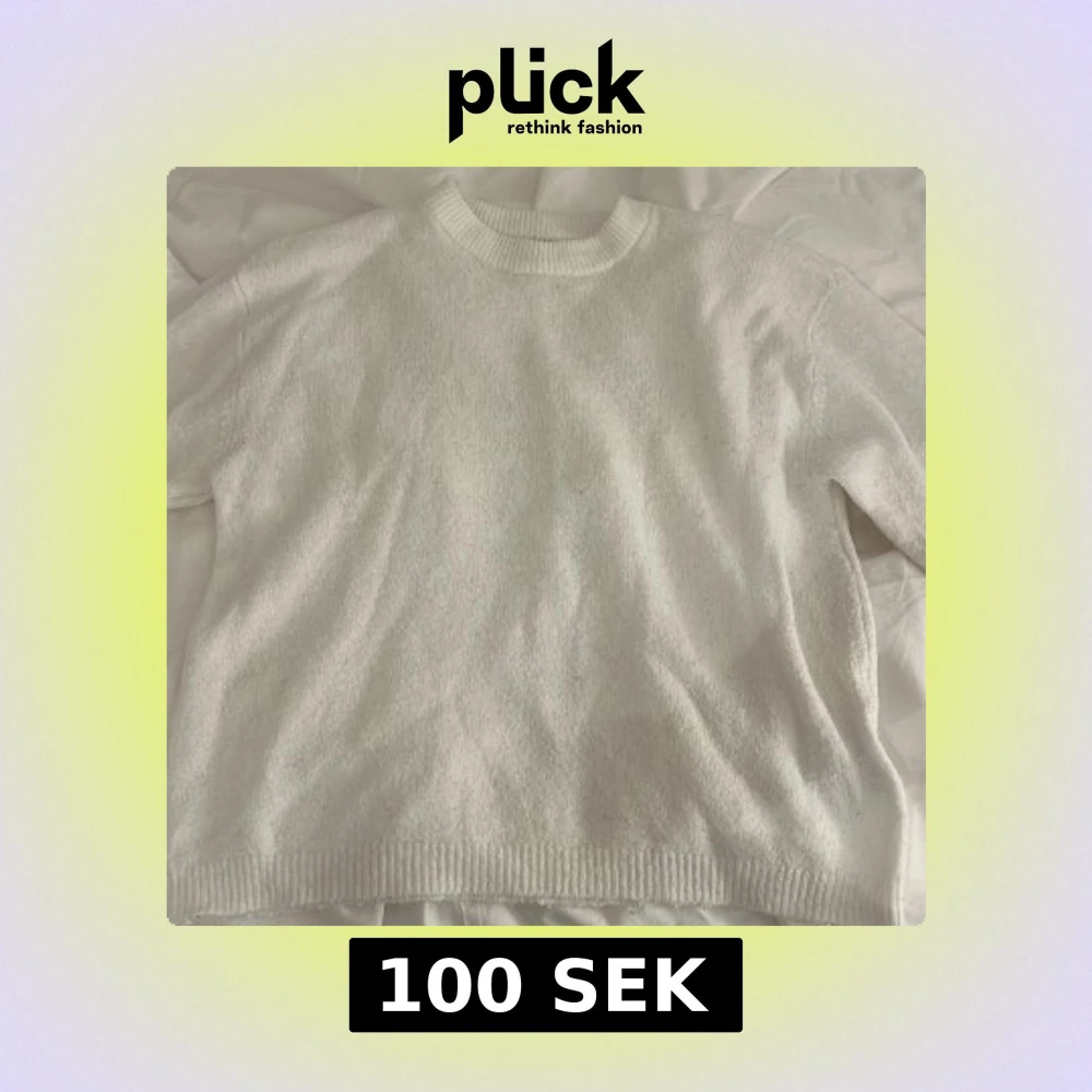 Mysig vit stickad tröja med rund halsringning och ribbade muddar vid ärmslut och nederkant. Perfekt för lager-på-lager och enkel att matcha med jeans eller kjol. Långärmad och i klassisk modell som funkar året runt.