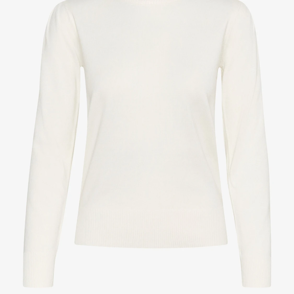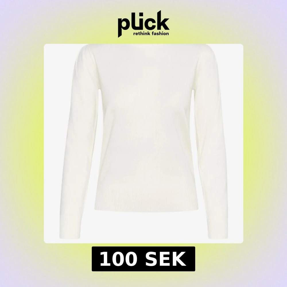 En stilren vit stickad tröja med rund hals och långa ärmar. Tröjan har en klassisk passform och ribbade muddar vid ärmslut och nederkant. Perfekt att matcha med jeans eller kjol för en clean look.