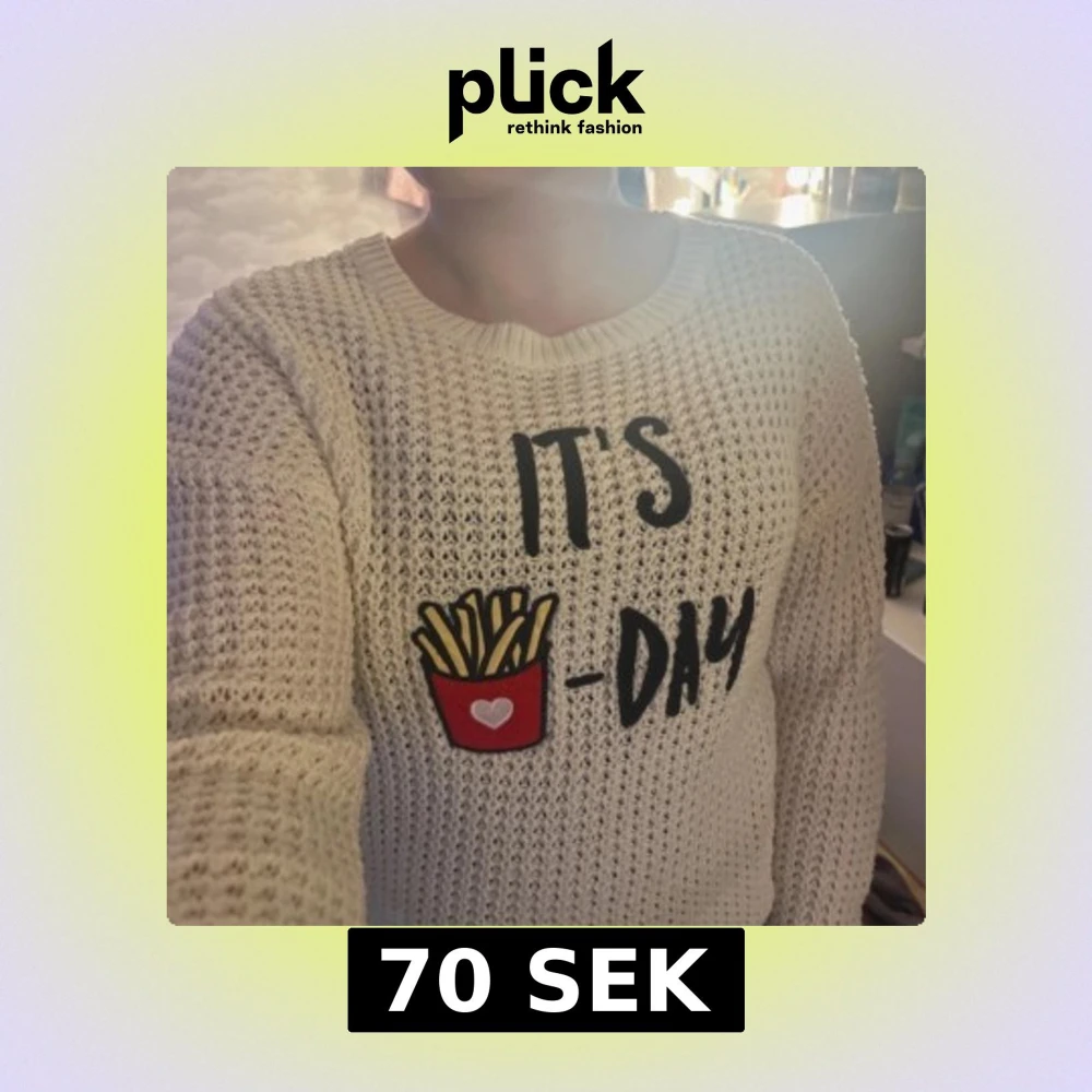 Säljer en vit stickad tröja från Primark med ett roligt tryck av pommes och texten 'IT'S 🍟-DAY'. Tröjan har en avslappnad passform och långa ärmar, perfekt för en mysig dag hemma. 🥰