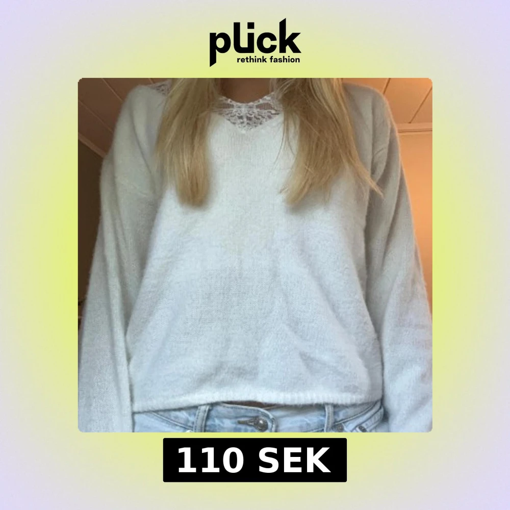 Vit stickad tröja med v-ringad hals och spetsdetalj.