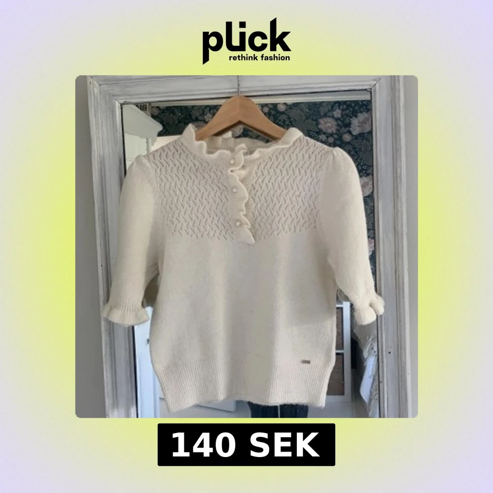 Supersöt vit stickad tröja från Holly & White med volangdetaljer vid hals och ärmslut. Tröjan har ett snyggt mönster upptill, pärlknappar och korta puffärmar.