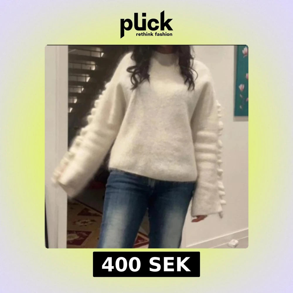 Superfin vit stickad tröja från Arket med breda långärmar och volangdetaljer längs ärmarna. Tröjan har en rund hals och är mjuk och fluffig i materialet, perfekt för att ge en mysig vibe till din outfit. Super trendig och slutsåld!!