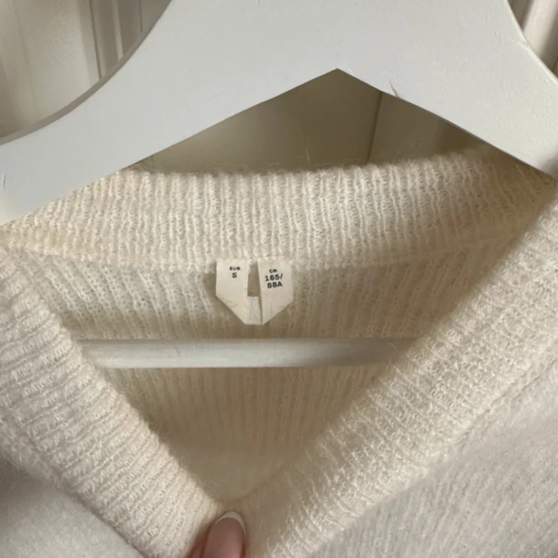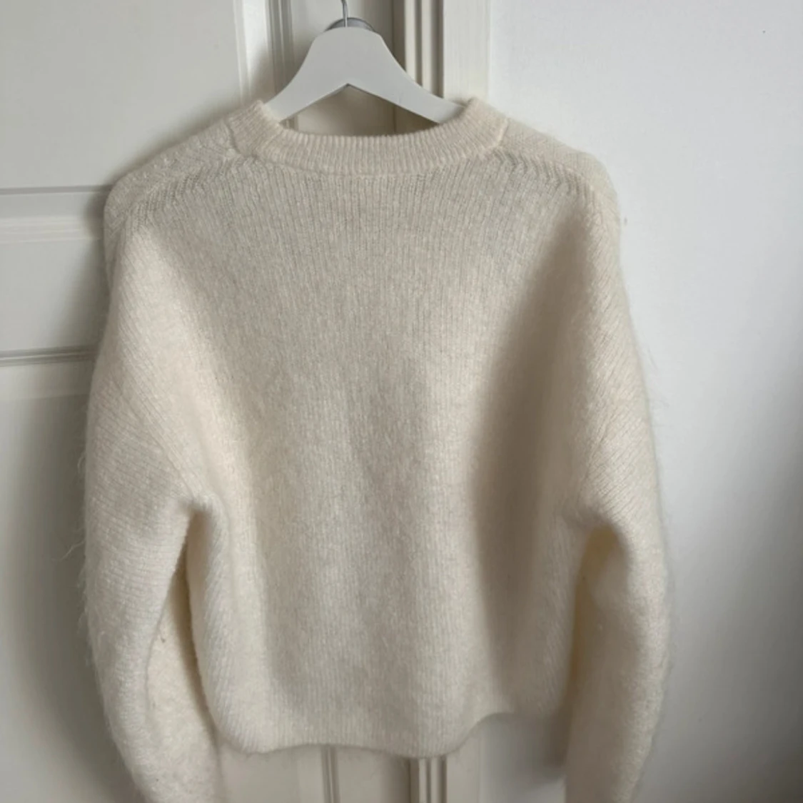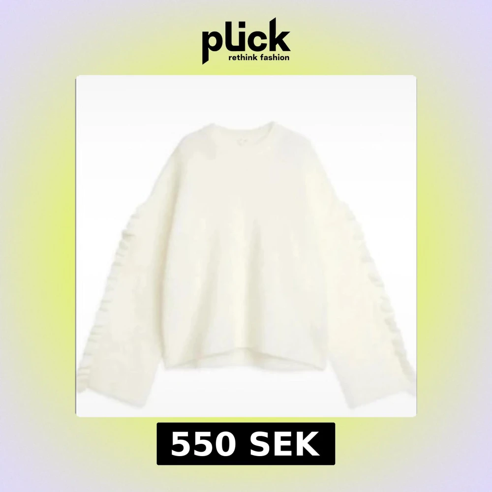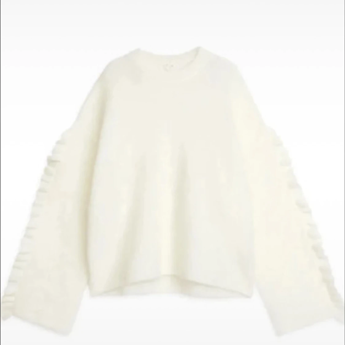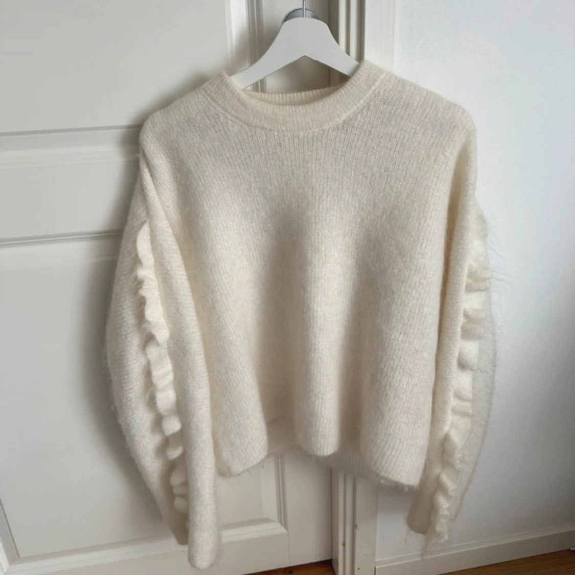 Superfin vit stickad tröja med volangdetaljer längs ärmarna. Tröjan har en rund halsringning och är långärmad. Använd Max 2ggr!