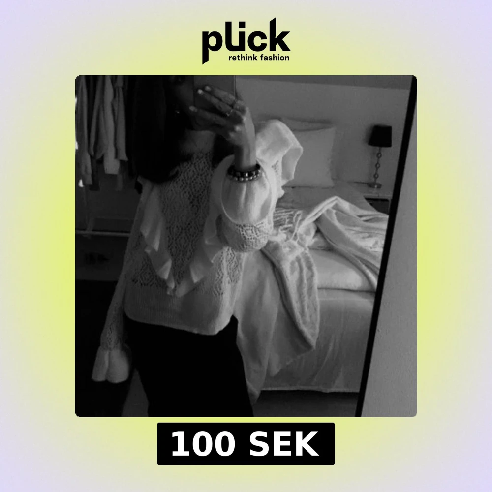 Säljer en vit stickad tröja med vackra volangdetaljer på ärmarna och framsidan. Tröjan har en unik design med ett luftigt stickmönster och långa ärmar. Perfekt för att ge en romantisk touch till din outfit.