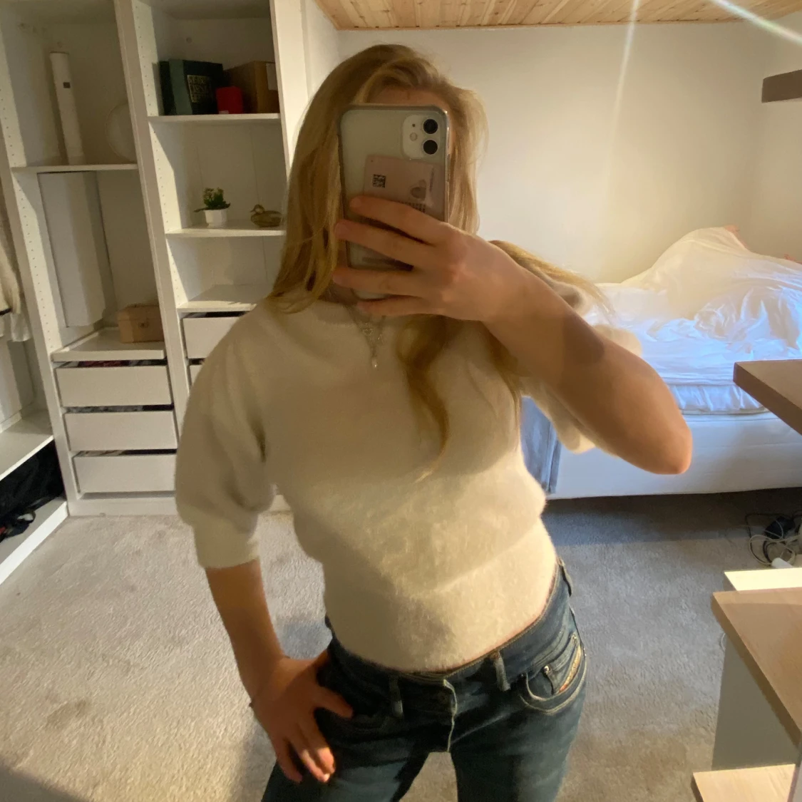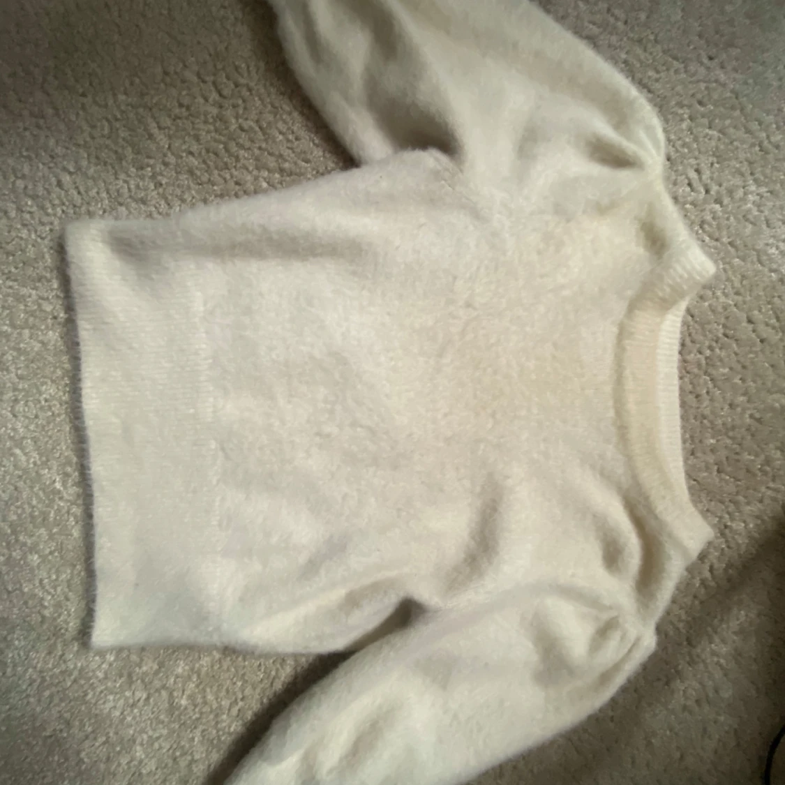 Säljer en mysig vit stickad tröja med puffiga ärmar. Den är fluffig och mysig, samt sparsamt använd ❤️