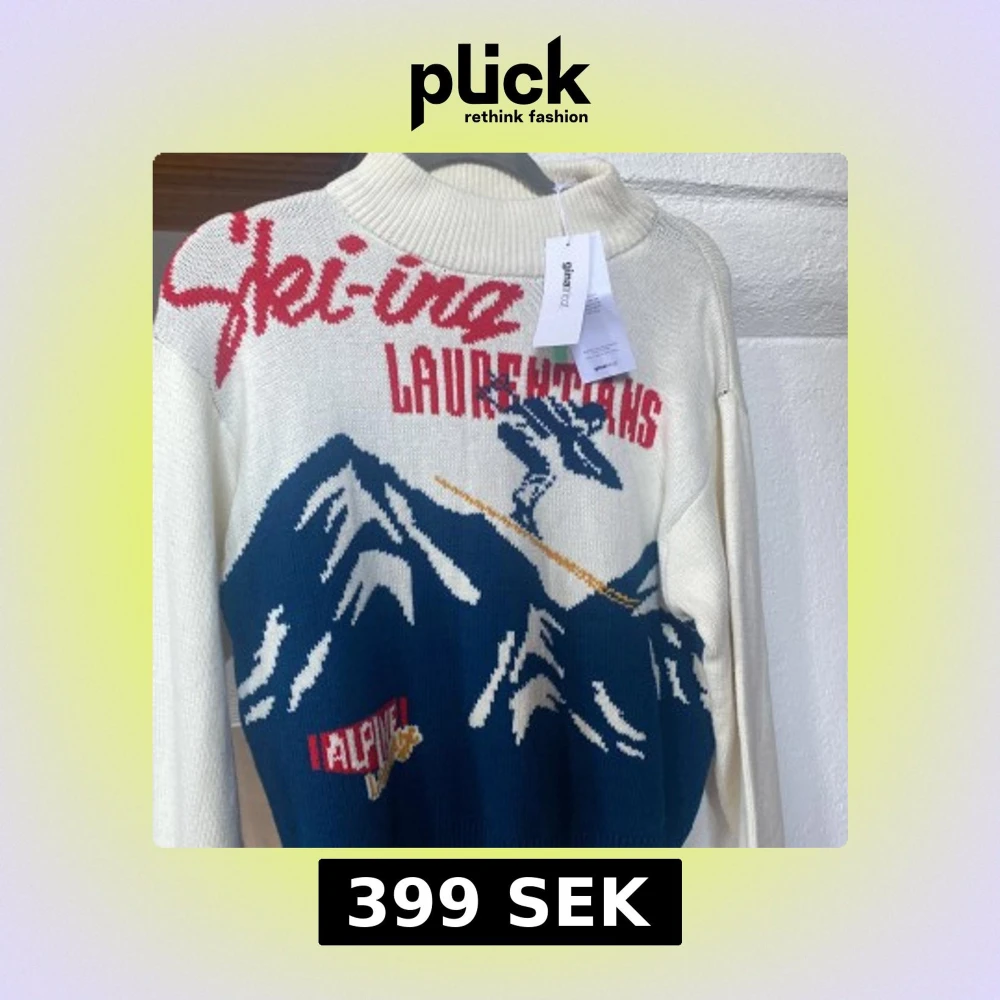 Säljer en cool vit stickad tröja från Gina tricot med ett retro skidmotiv i blått och rött. Perfekt till skidsäsong och afterskin. Helt ny😊