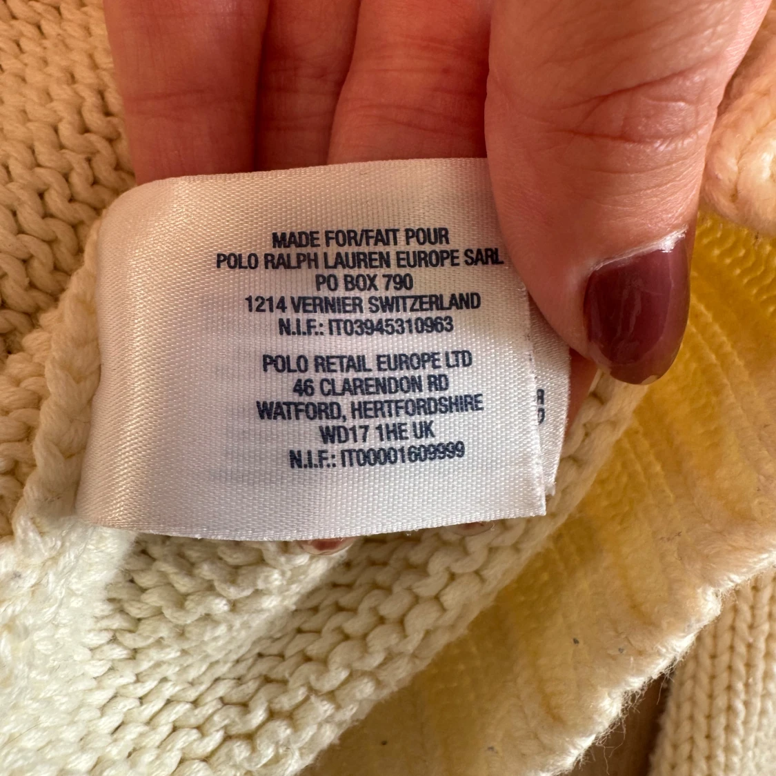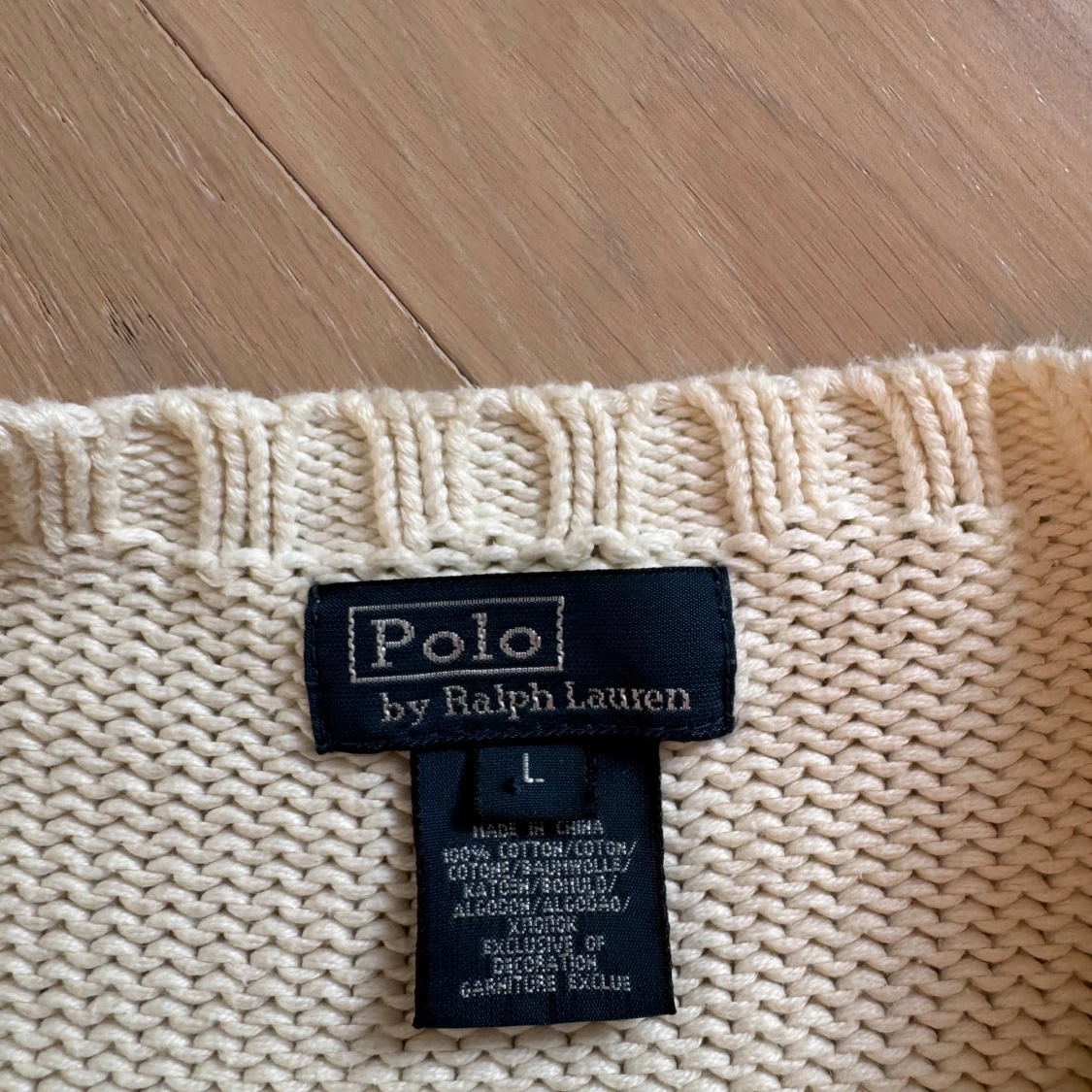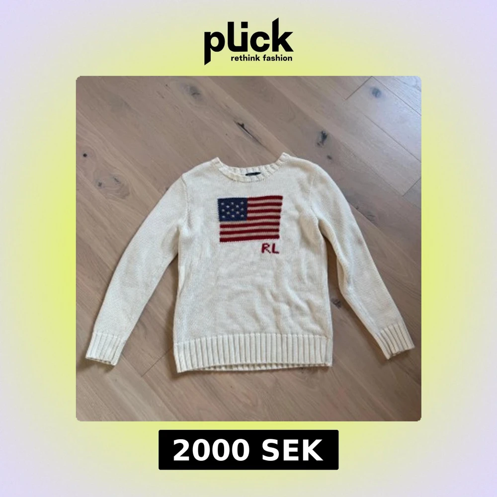 Vit stickad tröja från Polo Ralph Lauren med amerikansk flagga och RL-broderi på bröstet. Storlek L men skulle säga M. Tröjan har rund hals, ribbade muddar och är tillverkad i 100% bomull. Perfekt för dig som gillar klassisk och preppy stil.
