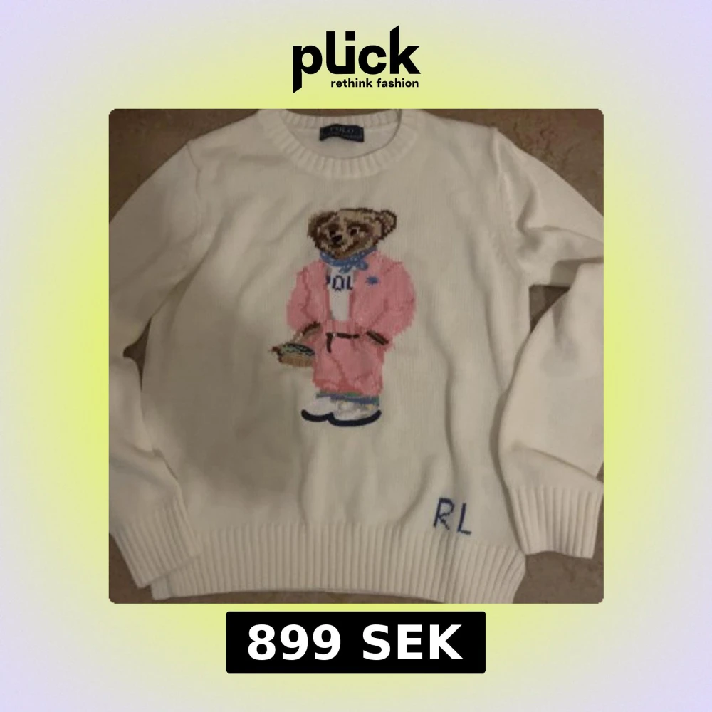 Vit stickad tröja från Polo Ralph Lauren med ikonisk björn i rosa outfit broderad på bröstet. Rund halsringning, ribbade muddar och RL-broderi nertill. Perfekt statement-piece för dig som gillar klassisk stil med en twist.