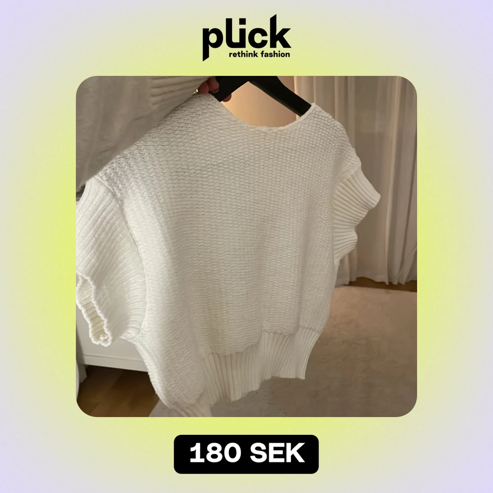 Superfin vit stickad tröja i mycket bra skick. Den har en loose passform och korta ärmar, perfekt för lager på lager-stil. Ribbad nederkant ger en snygg detalj.