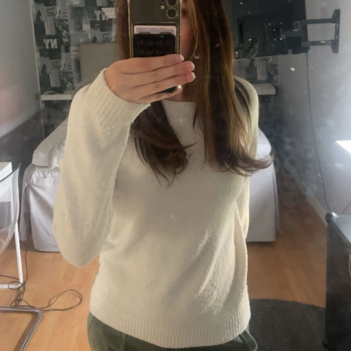 Säljer en enkel och fräsch vit stickad tröja med rund hals och långa ärmar. Tröjan har ribbade muddar vid ärmslut och nederkant, vilket ger en snygg och clean look. Perfekt att matcha med jeans eller cargo pants för en chill stil. Säljer för den inte kommer till användning