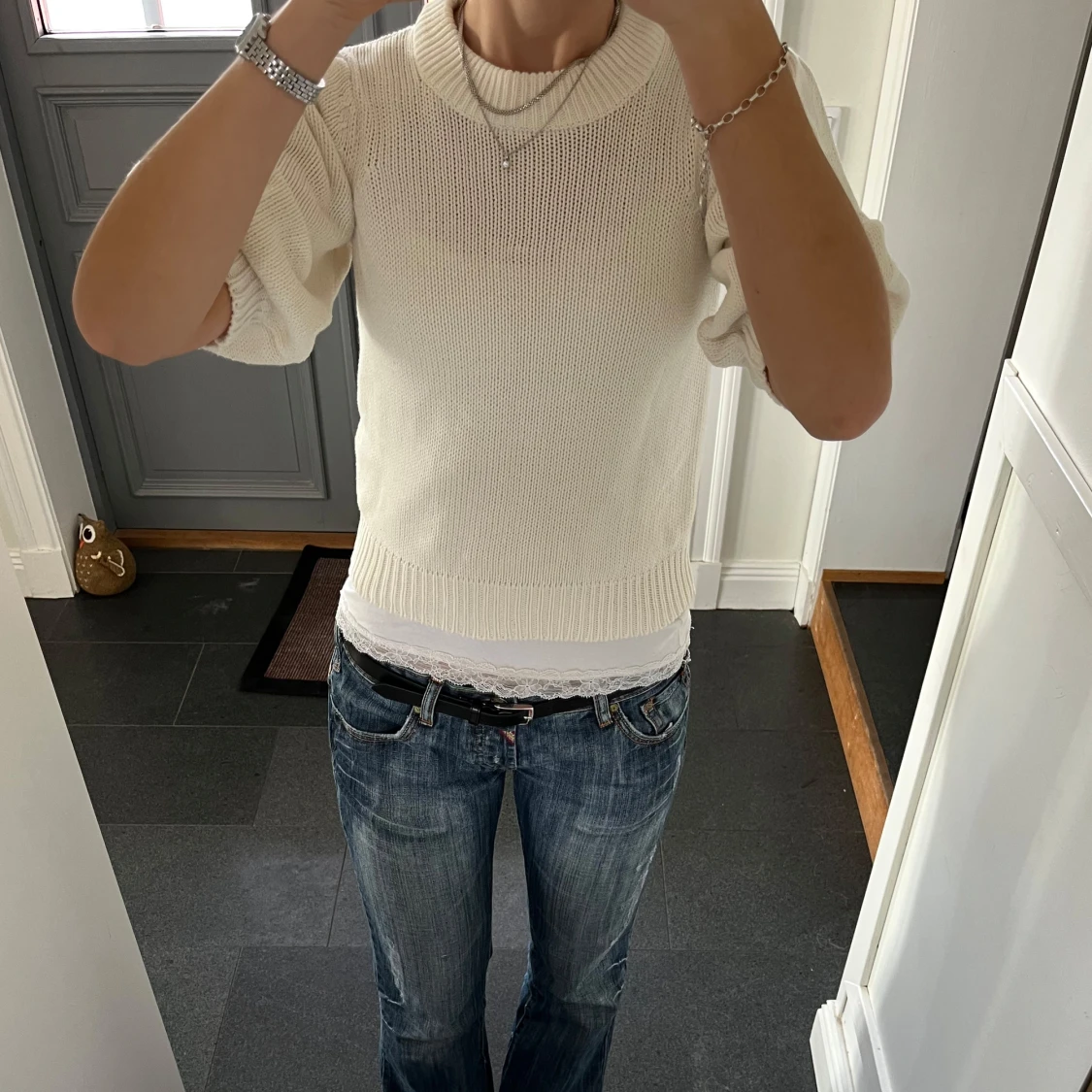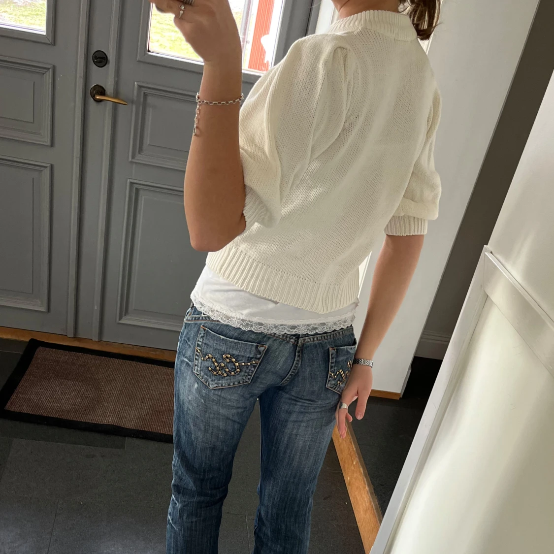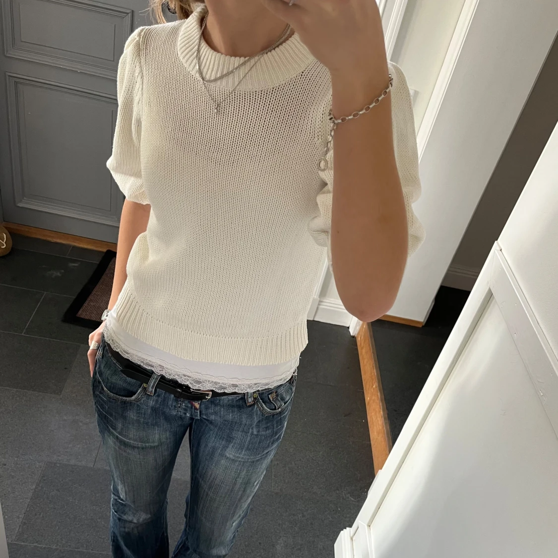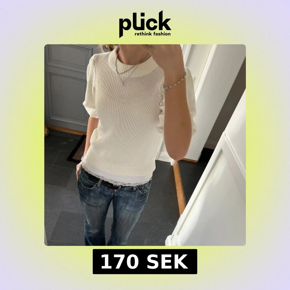 Trekvartsärmad vit stickad tröja från Ginatricot i storlek S, skulle säga att den även passar XS. Fint skick. Använd gärna köp nu!