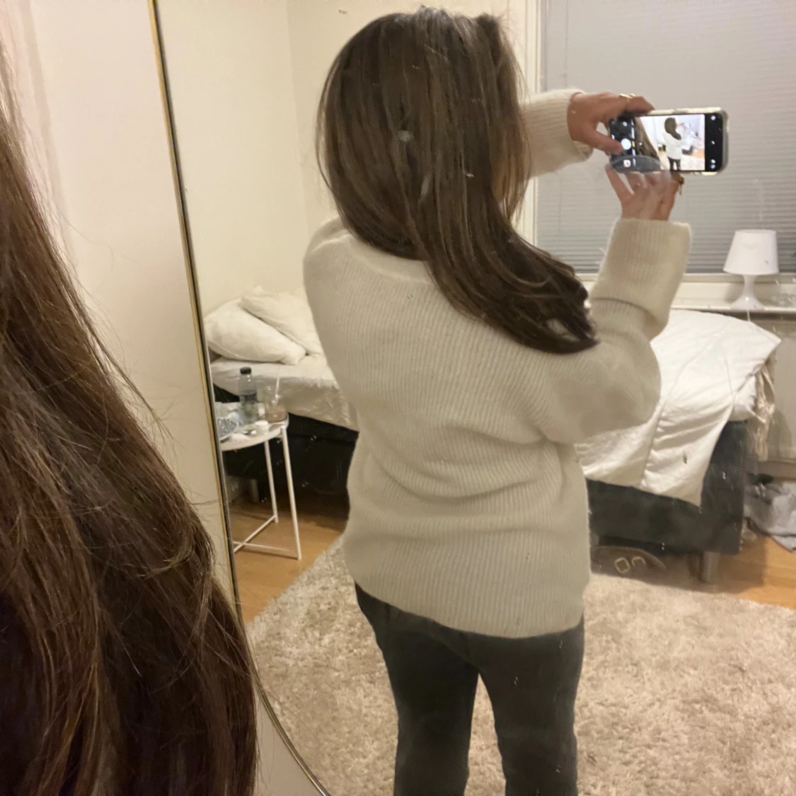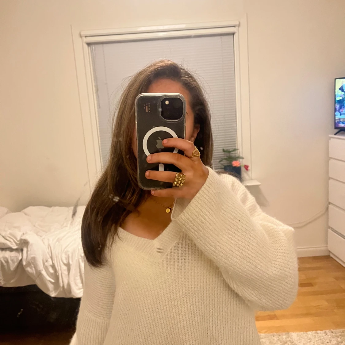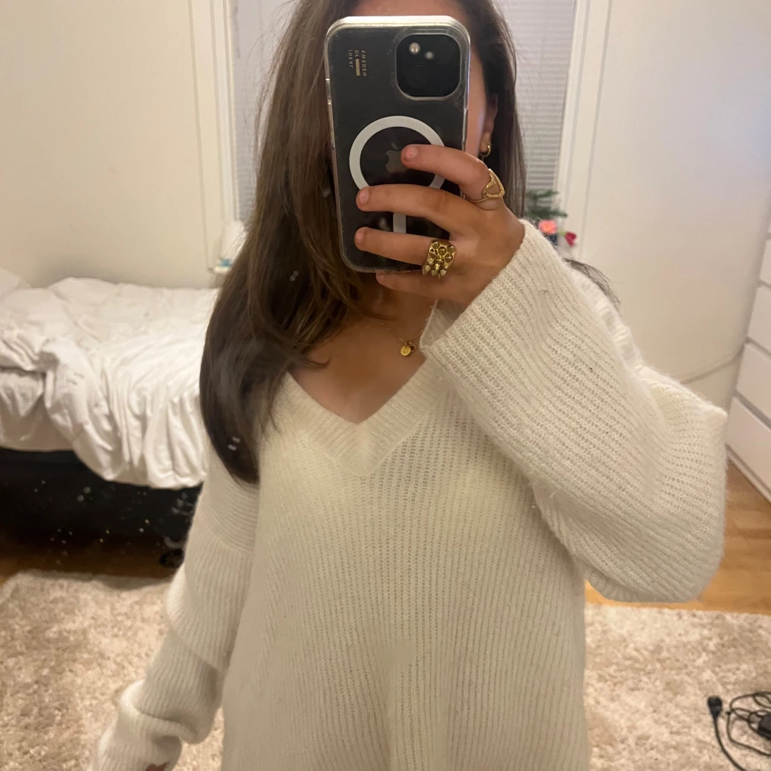 (Reporna är på spegeln) Mysig vit stickad tröja med v-ringning och långa ärmar. Tröjan har en loose passform och är ribbstickad för extra struktur. Perfekt för alla outfits och mys dagar. Superenkel att matcha med jeans eller kjol. 🤍