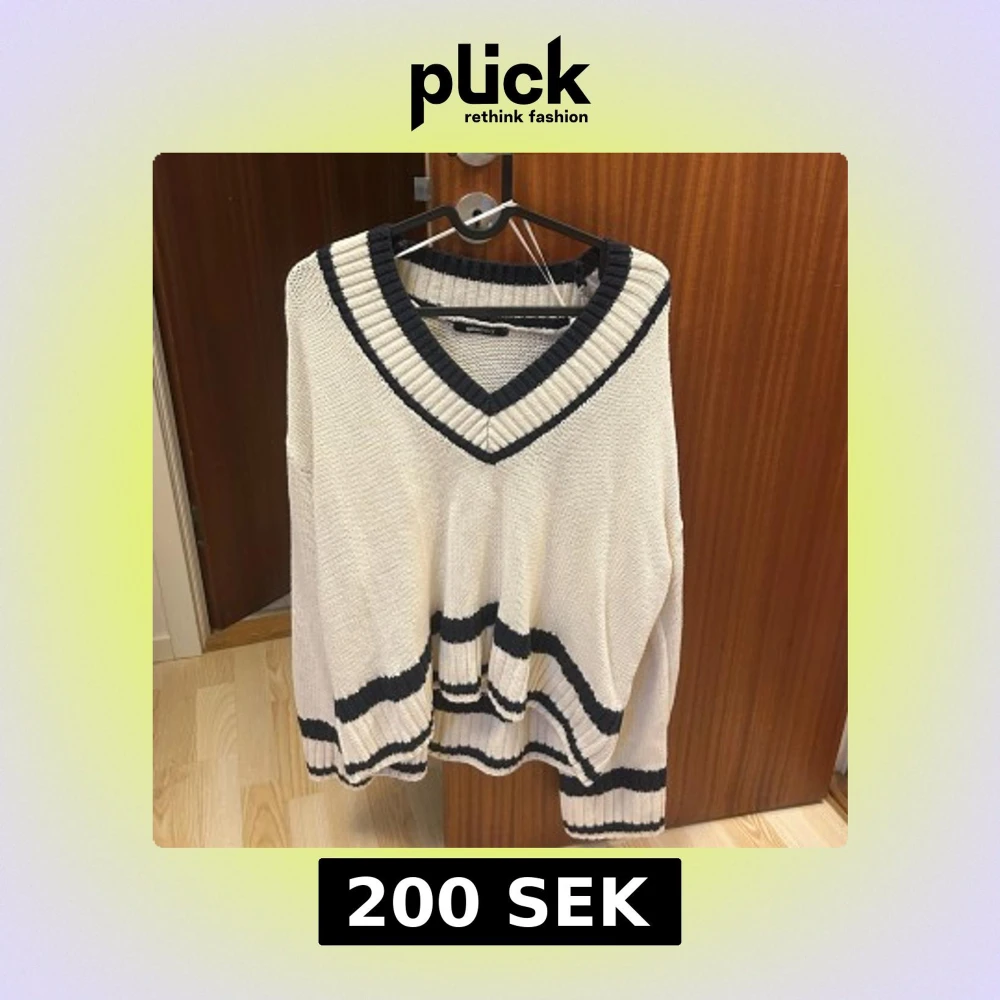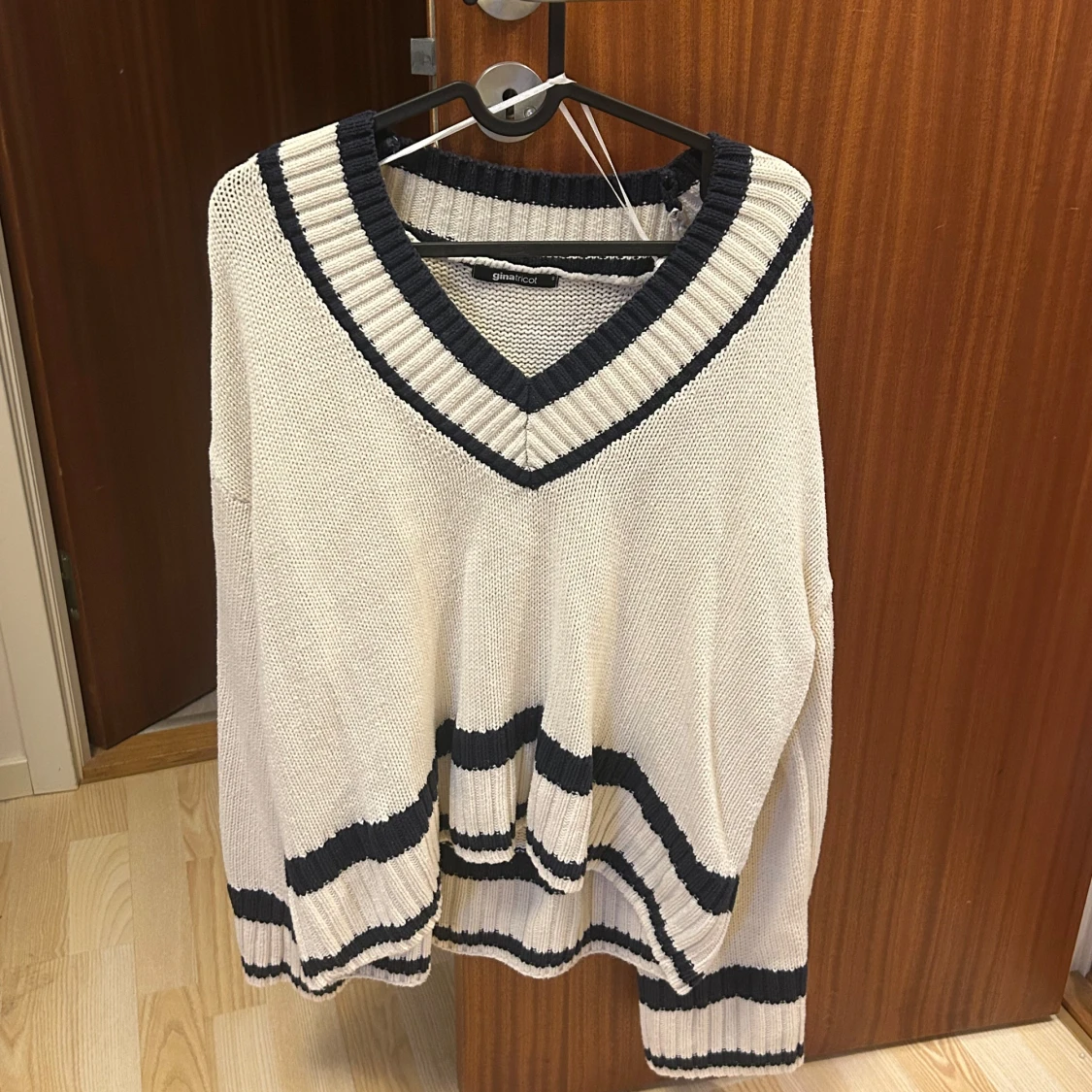 Säljer en vit stickad tröja från Gina Tricot med bred v-ringning och marinblå ränder vid hals, ärmslut och nederkant. Tröjan har en avslappnad passform och långa ärmar. Perfekt för lager-på-lager-stil. Köpt för 399kr