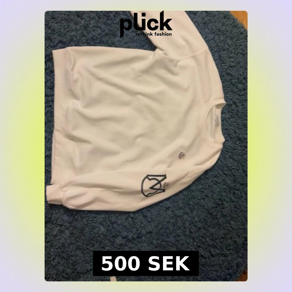 Säljer en vit sweatshirt med rund halsringning och svart tryckt logga på ena ärmen. ribbade muddar vid ärmslut och nederkant. Perfekt för en clean och stilren look. Storlek L men sitter som m