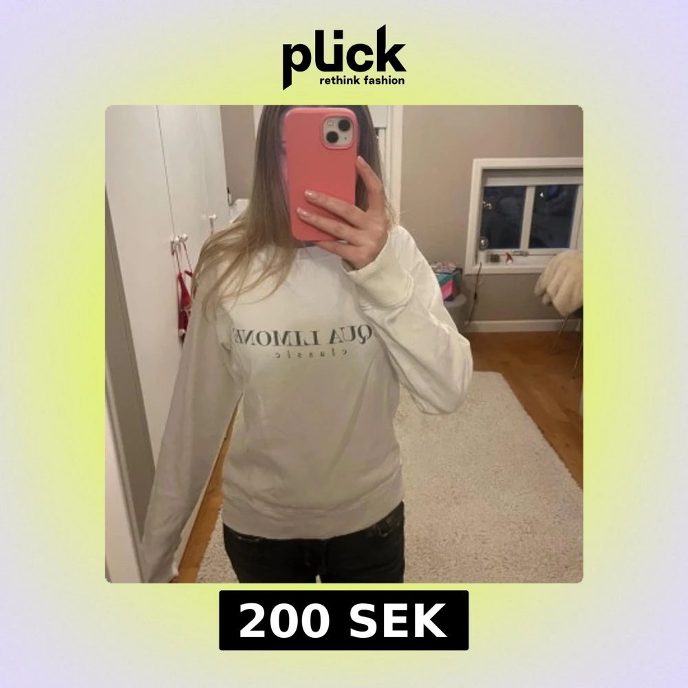 Säljer en vit sweatshirt från Acqua Limone med tryck av en gul citron på baksidan och text på framsidan. Tröjan har långa ärmar och en rund halsringning. Tröjan är i bra skick och i storlek xs 💕