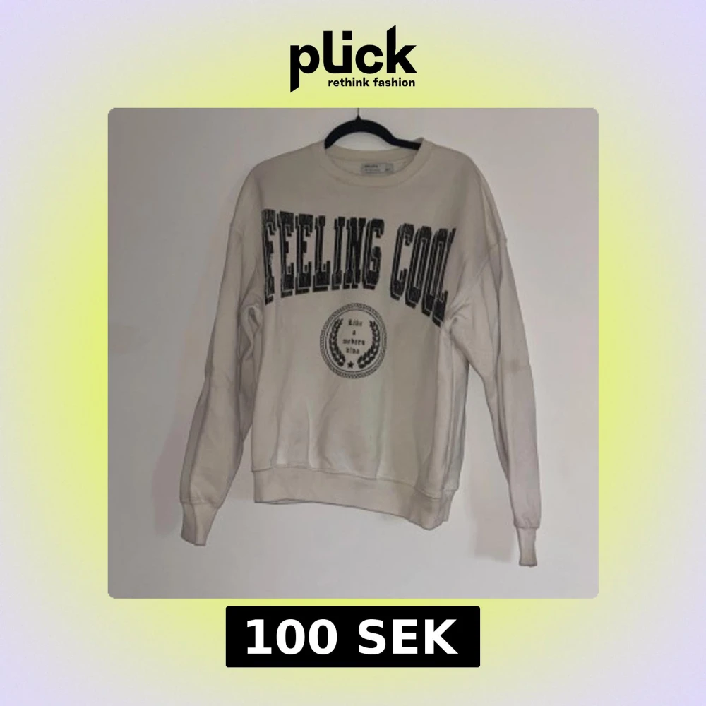 Säljer en vit sweatshirt från Bershka med texten 'FEELING COOL' i svart på framsidan. Tröjan har långa ärmar och en rund halsringning. Perfekt för en avslappnad stil. Lite missfärgningar annars fin