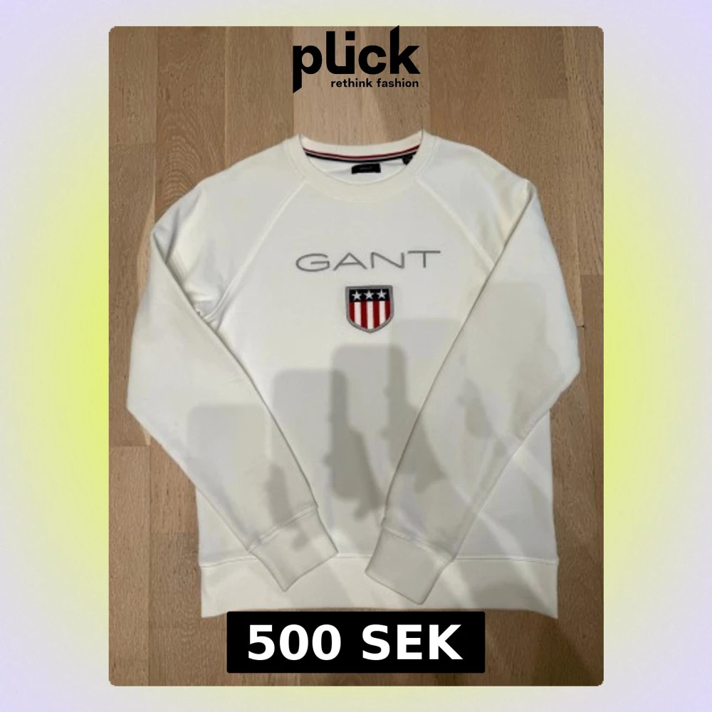 Vit sweatshirt från GANT med broderad logga och emblem på bröstet. Tröjan har rund hals, långa ärmar och ribbade muddar. Snygg detalj med röd och marinblå rand på insidan av kragen. Perfekt för en clean och sportig look.