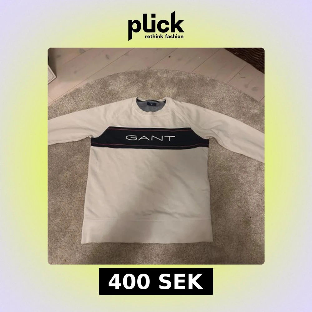 Säljer en vit långärmad sweatshirt från GANT med en mörkblå panel och broderad logga över bröstet. Tröjan har rund halsringning och klassisk passform. Perfekt för en stilren och avslappnad look.