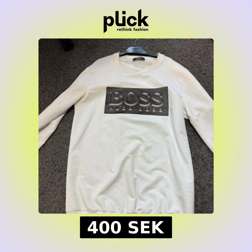 Säljer en stilren vit sweatshirt från Hugo Boss med ett stort svart BOSS-tryck på bröstet. Tröjan har rund halsringning och långa ärmar. Perfekt för en clean och modern look.