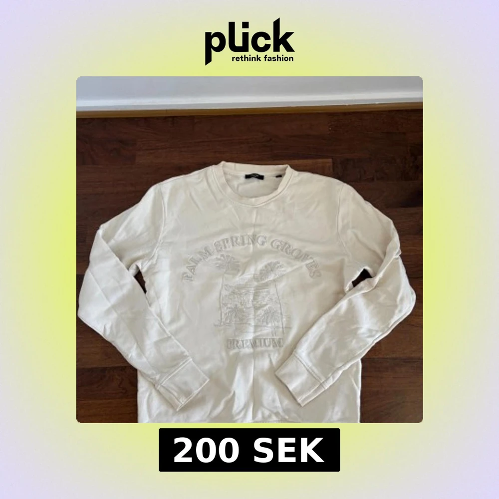 Säljer en stilren vit sweatshirt från Jack & Jones med broderad text och palm-motiv framtill. Tröjan har rund hals, långa ärmar och är tillverkad i mjuk bomull. Lite skrynklig så inte använt på länge.