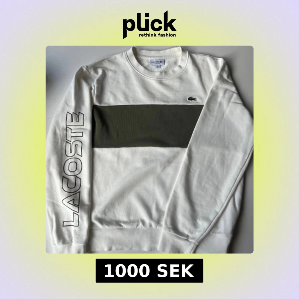 Säljer en clean vit sweatshirt från Lacoste i bomull med en bred olivgrön panel över bröstet och klassisk krokodillogga. Långärmad med stor LACOSTE-text längs ena ärmen. Perfekt för dig som gillar stilrena och sportiga vibes.