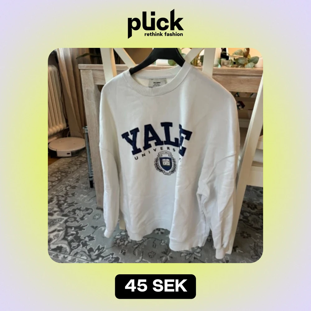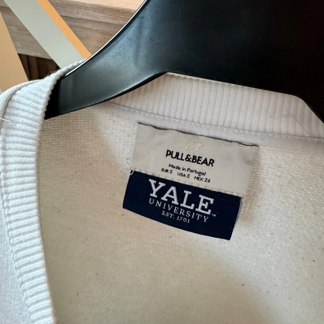 Säljer en snygg vit sweatshirt från Pull&Bear med ett stort Yale University-tryck i mörkblått på framsidan. Tröjan är perfekt för en avslappnad stil och har långa ärmar. Den är i bra men använt skick och passar perfekt för höst och vår.