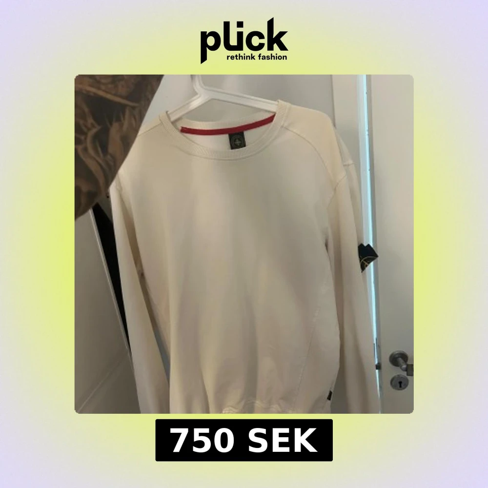 Säljer en clean vit sweatshirt från Stone Island med klassisk patch på vänster ärm. Tröjan har rund hals, långa ärmar och en röd detalj på insidan av kragen. Perfekt för dig som gillar stilrena och exklusiva plagg.