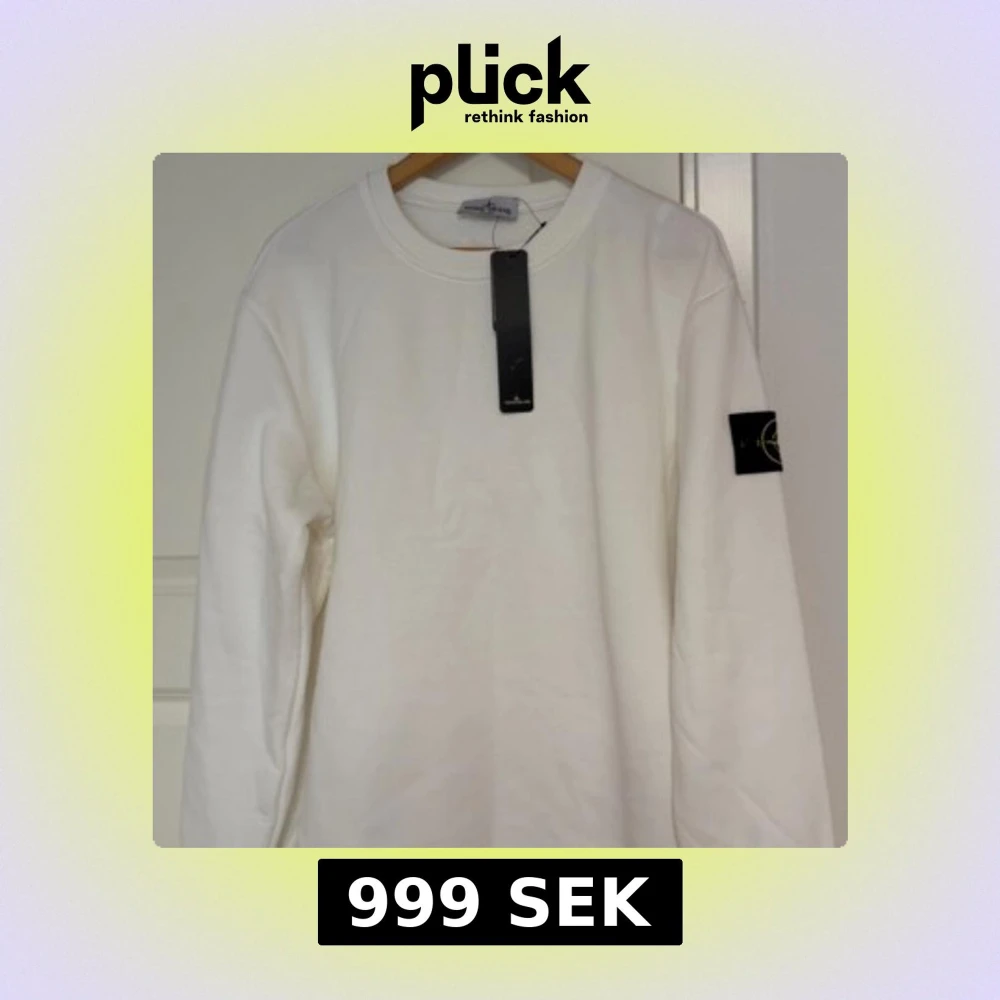 Vit långärmad sweatshirt från Stone Island med klassisk rund hals och ikonisk logopatch på vänster ärm. Tröjan är gjord i mjuk bomull och har en clean, stilren look som passar perfekt till jeans eller cargo. Snyggt och enkelt statement-plagg för dig som gillar streetwear. #trendtriangeln (STORLEK L MEN PASSAR ÄVEN XL