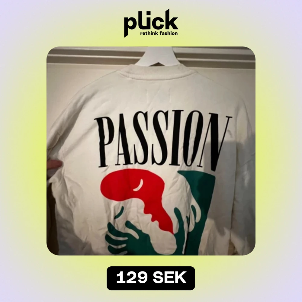 Säljer en snygg vit sweatshirt i storlek M. Tröjan har ett coolt tryck med texten 'PASSION' och en design i rött och grönt. Perfekt för en avslappnad stil eller att bära till vardags. Den är i bra skick och superbekväm! Kan mötas upp i Karlstad